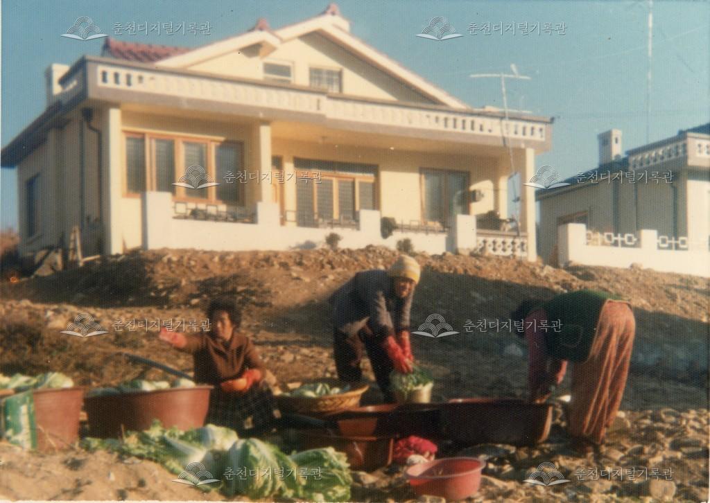 동산면 원창리 새마을주택 등록번호 00005042 생산일자 1980 생산지역 춘천시 동산면 원창2리 생산자 미상 수집처 정귀남 소장자 정귀남 내용 1980년 춘천 동산면 원창리의 새마을주택 모습이다. 새마을 주택에 거주하는 듯한 아주머니들이 배추를 다듬고 있다. 사용안내 비상업적 이용만 가능|©춘천디지털기록관 상업적 사용·수정·재배포는 저작권자 동의 필요 다운로드 목록보기
