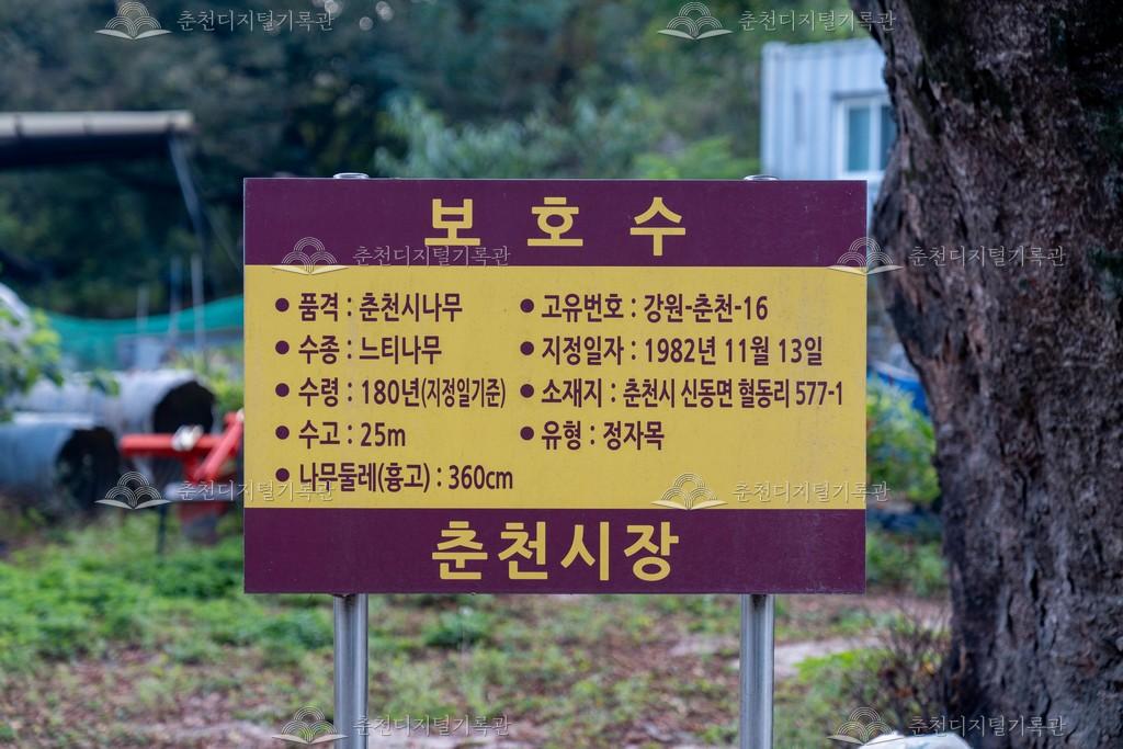 혈동리 느티나무 등록번호 00006625 생산일자 2024 생산지역 춘천시 신동면 혈동리 생산자 매스웨이브 수집처 미상 소장자 춘천학연구소 내용 혈동리 느티나무는 혈동2리 마을회관 옆에 있다. 수령이 거의 250년이 된 정자목으로 1982년 고유번호 강원-춘천-16호로 지정되었다. 둘레는 3.6m이고 높이는 26m 정도 된다. 자세히 보기 닫기 사용안내 비상업적 이용만 가능|©춘천디지털기록관 상업적 사용·수정·재배포는 저작권자 동의 필요 다운로드 목록보기