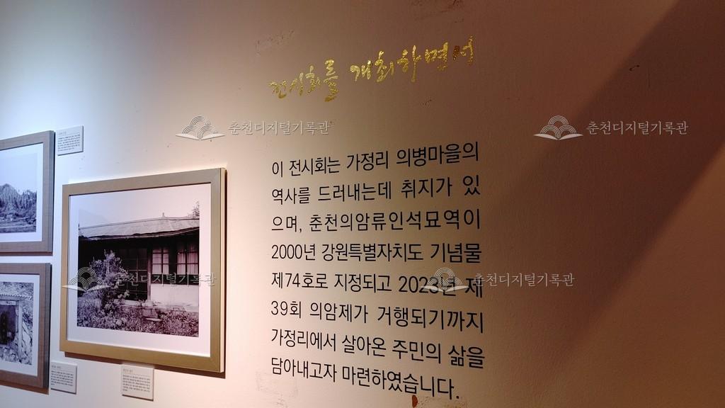 가정리 의병마을 사진전 모습 등록번호 00005002 생산일자 2023.12.19 생산지역 춘천 남면 가정리 생산자 미상 수집처 의암류인석기념관 소장자 의암류인석기념관 내용 가정리 의병마을의 역사를 드러내기 위해 가정리 의병마을 사진전을 2023년 12월 의암류인석기념관 기획전시실에서 진행하였다. 가정리에서 살아온 사람들, 의병의 묘역, 가정리의 자연을 담아낸 사진을 전시하였다. 자세히 보기 닫기 사용안내 비상업적 이용만 가능|©춘천디지털기록관 상업적 사용·수정·재배포는 저작권자 동의 필요 다운로드 목록보기
