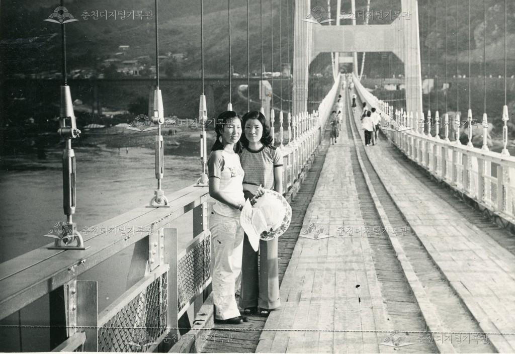 강촌 출렁다리 위에서 등록번호 00005043 생산일자 1973 생산지역 춘천시 남산면 생산자 미상 수집처 박경자 소장자 박경자 내용 1973년 춘천 남산면 강촌의 출렁다리 위에서 촬영하였다. 거대한 출렁다리가 인상적이다. 사용안내 비상업적 이용만 가능|©춘천디지털기록관 상업적 사용·수정·재배포는 저작권자 동의 필요 다운로드 목록보기
