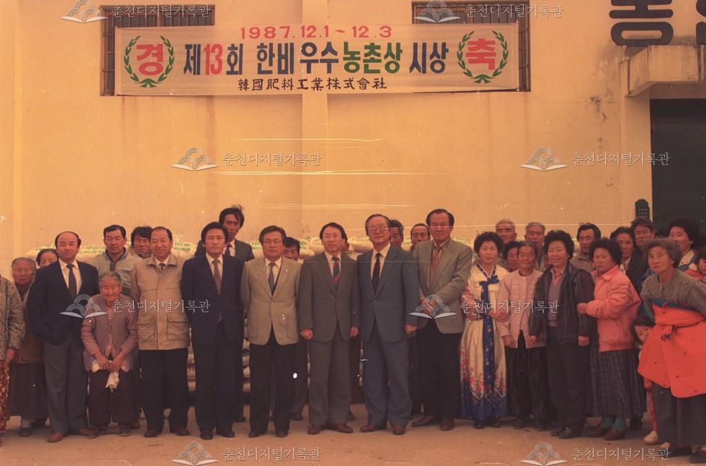 제13회 한비 우수농촌상 시상식 등록번호 00004745 생산일자 1987.12.01 생산지역 춘천 신북읍 지내리 생산자 춘천시청 수집처 춘천시청 소장자 춘천시청 내용 제13회 한국비료공업주식회사 한비 우수농촌상 수상 사용안내 비상업적 이용만 가능|©춘천디지털기록관 상업적 사용·수정·재배포는 저작권자 동의 필요 다운로드 목록보기