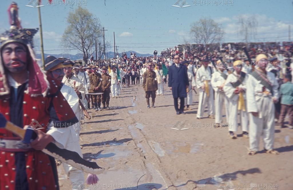 짚신을 신고 조총을 멘 의병들이 왜병들을 체포하여 오랏줄로 묶어 이송하는 장면과 춘천의병대장 이소응으로 분장한 듯한 가장행렬 단이 거리행진을 하고 행사장으로 들어오는 모습이다. 전날 비가 왔는지 진입로 바닥에 빗물이 흥건하다. 가장행렬을 보고자 높은 곳까지 많은 인파들이 몰려있다. [출처] 『봄고을의 향연(2021)』 참고