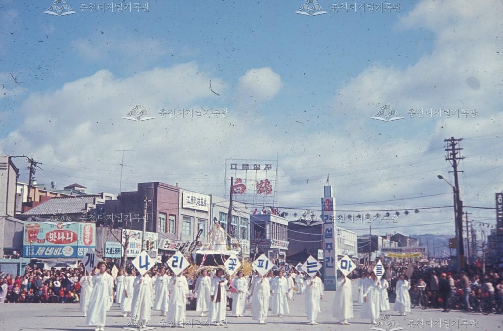 한복과 머리에 개나리꽃으로 단장한 여학생들의 개나리 꽃피는 마을 피켓을 선두로 개나리 미인이 탑승한 차량과 가장 행렬단이 인도를 메운 많은 군중사이로 지나가고 있다. 뒤편 건물옥상의 백학청주 네온과 닭표 맛나니 간판이 이채롭다. 맛나니는 미원, 미풍 등과 우리나라를 풍미했던 조미료 상품이었다. 도로를 점용해야 했기에 경찰이 동원되어 차량을 통제하였지만 교통 불편정도는 당연히 감수하던 시절이었다. [출처] 『봄고을의 향연(2021)』 참고