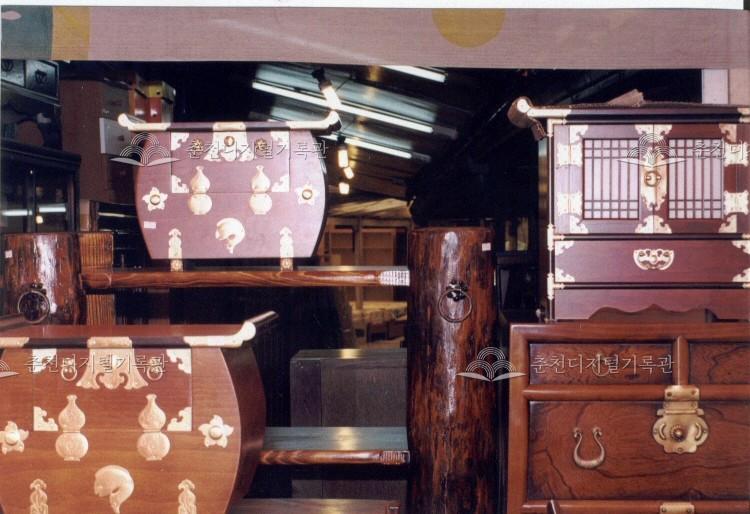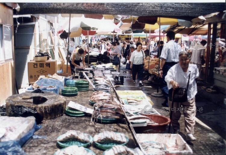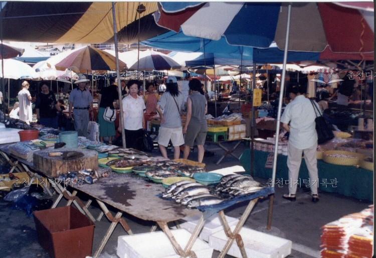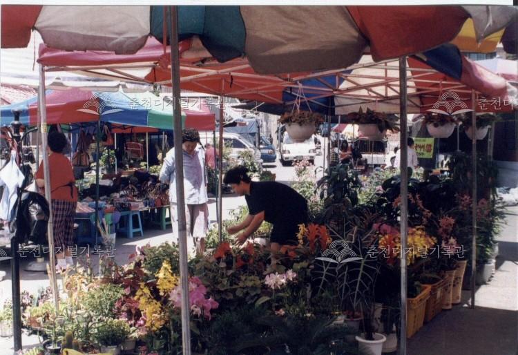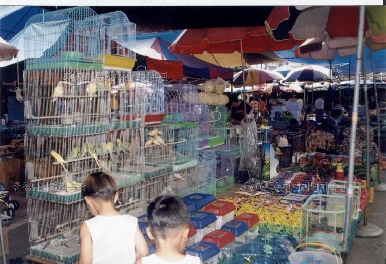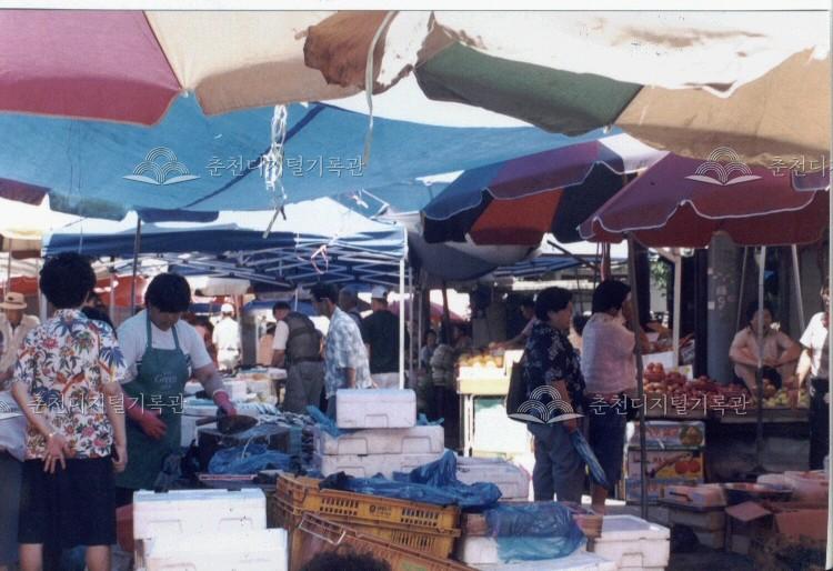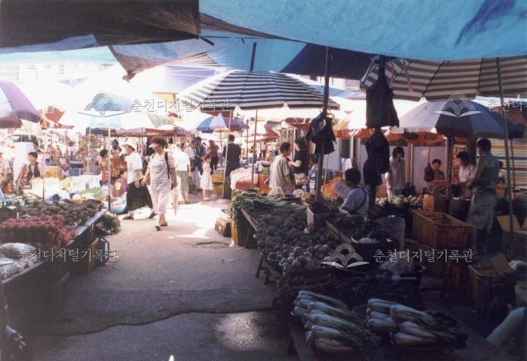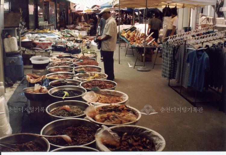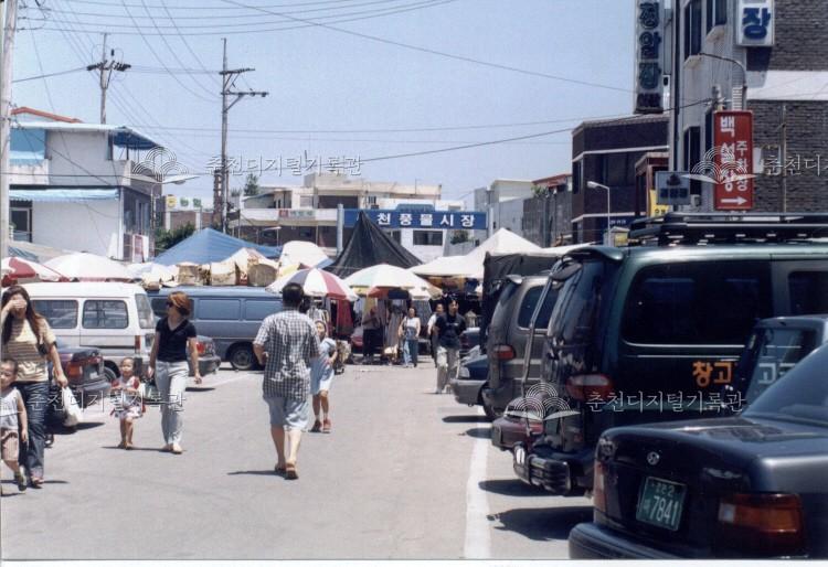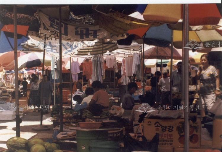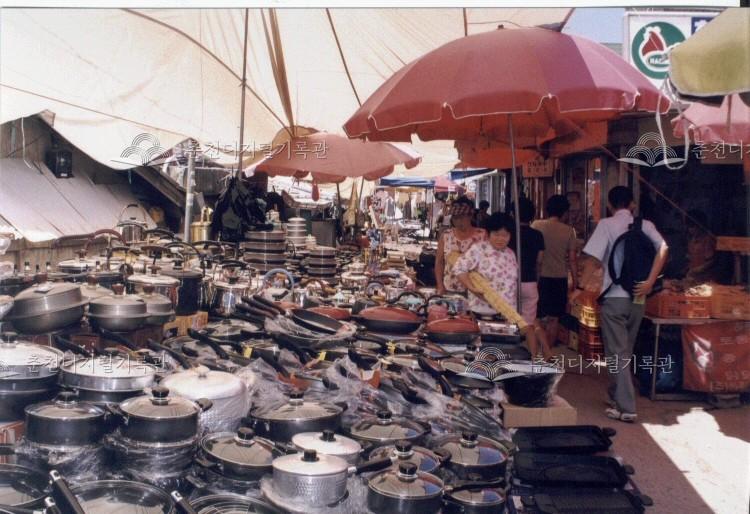 2000년대 초반에 촬영된 약사동 풍물시장 풍경이다. 약사동 풍물시장은 1989년 도심 노점상 정비에 따라 명동, 중앙로 일대 노점상을 약사천 복개 공간(1984년 복개)에 집단 이주시켜 형성된 시장이다. 초창기에는 ‘약사풍물거리’로 불리면서 2일과 7일 개장하는 5일장으로 운영되었다. 2008년부터 춘천시가 추진한 약사천 복원 사업에 따라 2010년 11월 10일 온의동 지역으로 이전 개장하였다.