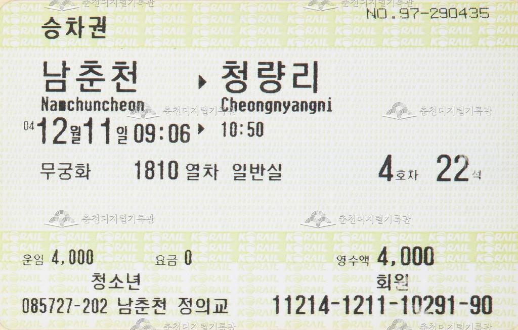 무궁화호 승차권 : 남춘천-청량리 청소년