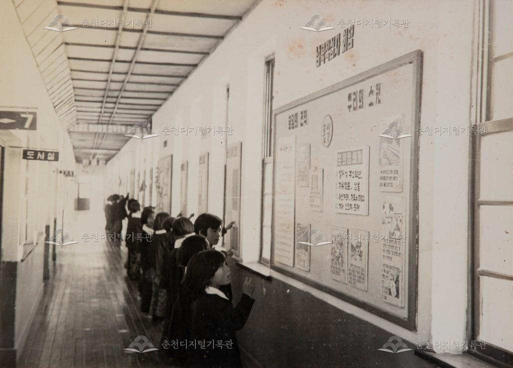 1974년 근화국민학교(현재 근화초등학교) 학생들의 중간놀이 모습이다. 중간놀이 후 점심식사와 청소를 하며 하루가 끝났다. 1970년대 근화국민학교 주변 모습과 교사(校舍), 남북적십자 회담 내용을 담은 게시판이 보인다.