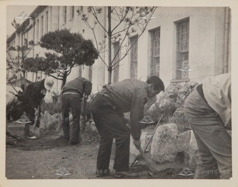 1975년 근화국민학교(현재 근화초등학교) 식수(植樹) 모습이다. 조경석 앞에 나무를 심고 있다.