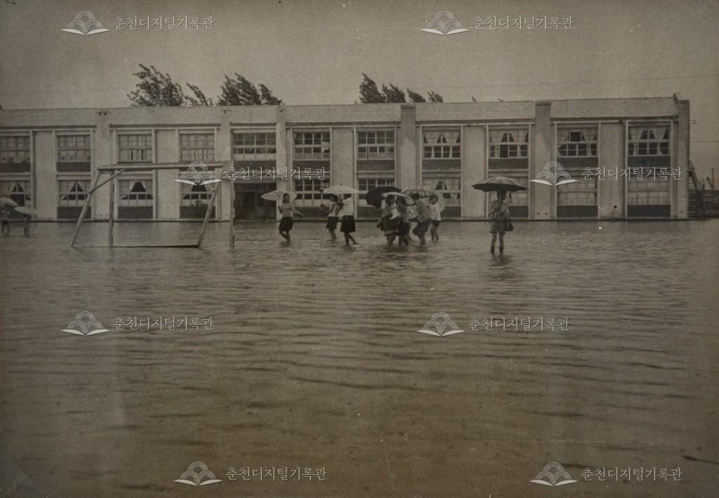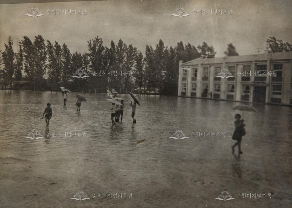 1968년 9월 5일 폭우로 침수된 근화국민학교(현재 근화초등학교) 운동장 모습이다. 운동장 전체에 약 30cm 가량의 물이 고여있다. 어린이들은 호수가 된 운동장에서 장난을 하고 있다. 하수도 공사 이전의 모습이다.