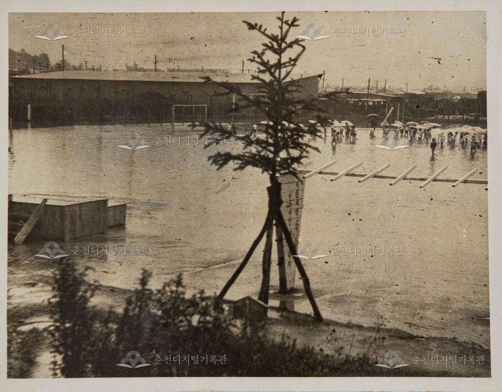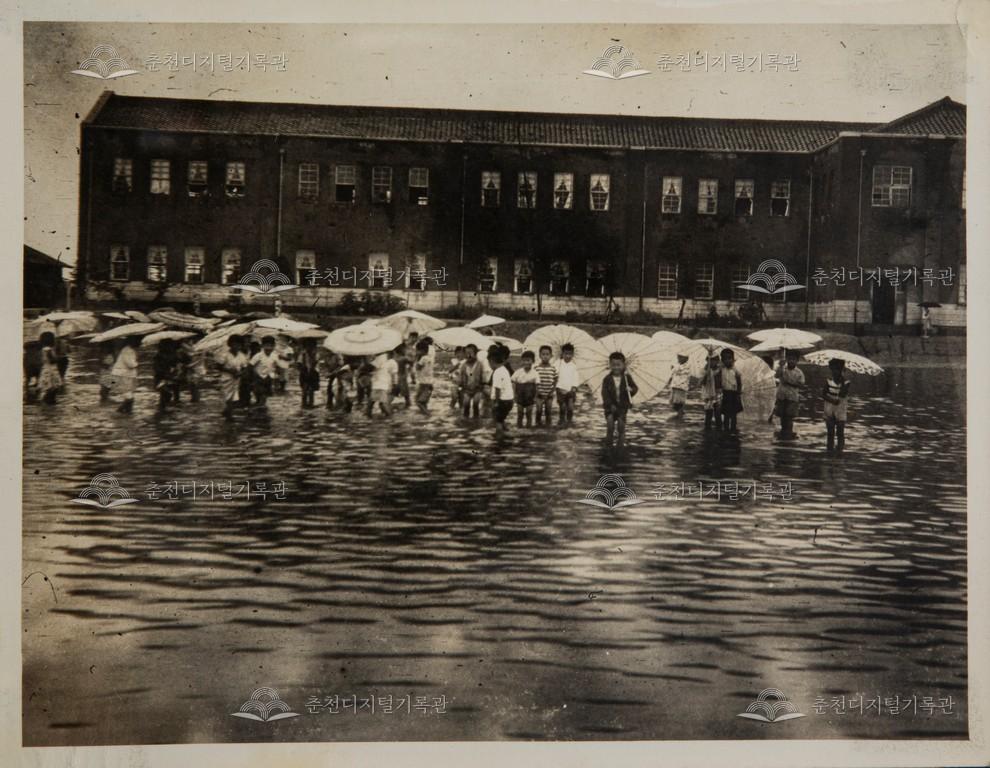 1960년대 폭우로 침수된 근화국민학교(현재 근화초등학교) 운동장 모습이다.