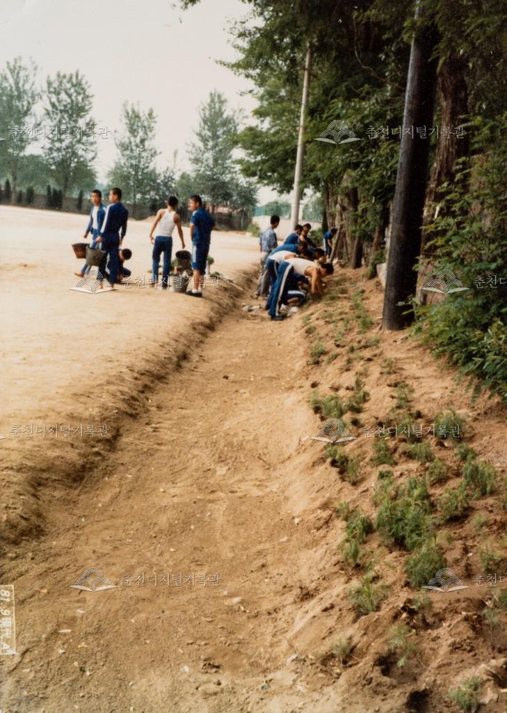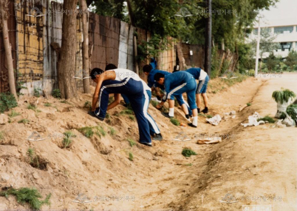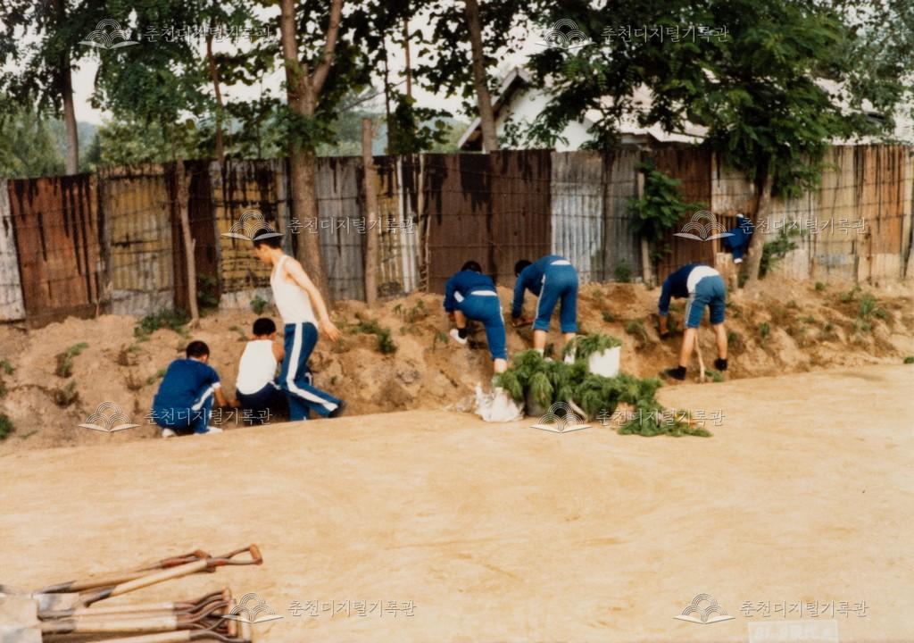 1981년 춘성중학교 운동장 옆에 화초를 심고 있다.