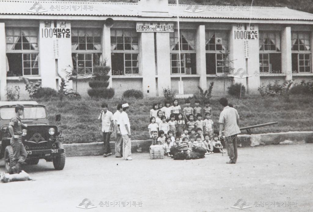 자매부대의 물품 증정 등록번호 00005854 생산일자 미상 생산지역 춘천시 신북읍 생산자 춘성중학교 수집처 춘성중학교 소장자 춘성중학교 내용 자매부대에서 벽지학교에 물품을 증정하고 있다. 학용품 상자와 빗자루가 보인다. 사용안내 비상업적 이용만 가능|©춘천디지털기록관 상업적 사용·수정·재배포는 저작권자 동의 필요 다운로드 목록보기