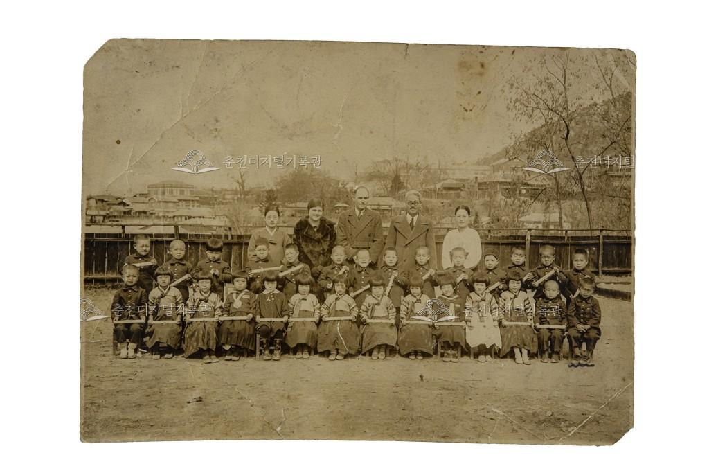 일제강점기 1938년에 촬영한 춘천유치원 졸업식 사진이다. 한복과 교복을 입은 학생들이 졸업장을 손에 쥐고 있다. 춘천유치원은 1924년 남감리회 춘천교회(현재 춘천중앙교회)의 발기로 다수의 유지자와 협력하여 설립, 운영되었다. 사진 뒤편에 봉의산 자락과 읍내 모습을 살펴볼 수 있다.