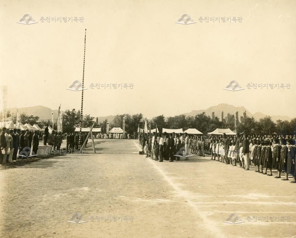 일제강점기 춘천군(현재 춘천시) 체육대회 개막식 혹은 폐회식 사진으로 추정된다. 당시 춘천지역에서는 춘천군 체육협회가 주최하여 정기적으로 춘천고등보통학교(현재 춘천고등학교) 운동장에서 군민 체육대회를 개최하였다. 춘천 관내 학교, 면, 정(町 : 지금의 동), 도청 각과, 직속기관 등 행정기관이 참여하였다. 주 종목은 육상 경기였다.