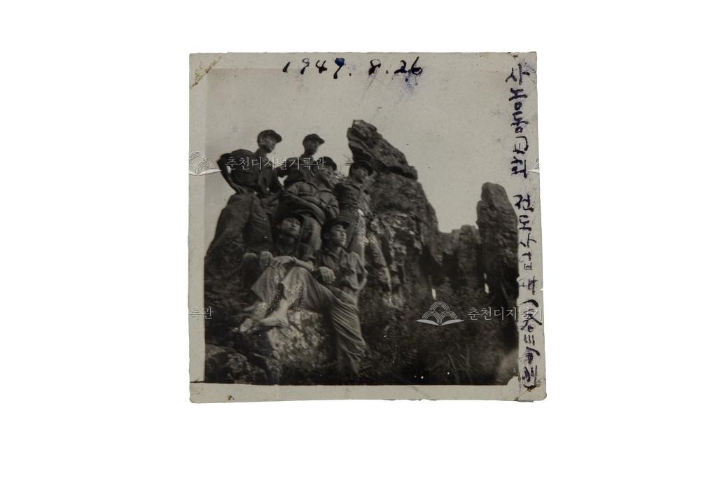 해방직후 삼악산 등정 사진 등록번호 00000785 생산일자 1949.08.26 생산지역 춘천시 서면 덕두원리 생산자 미상 수집처 지희준 소장자 춘천학연구소 내용 1949년에 촬영한 삼악산 등정 사진이다. 사농동 교회 전도사업 중 등정한 것으로 추정된다. 사진에 표기된 金剛(금강)은 삼악산을 뜻한다. 자세히 보기 닫기 사용안내 비상업적 이용만 가능|©춘천디지털기록관 상업적 사용·수정·재배포는 저작권자 동의 필요 다운로드 목록보기