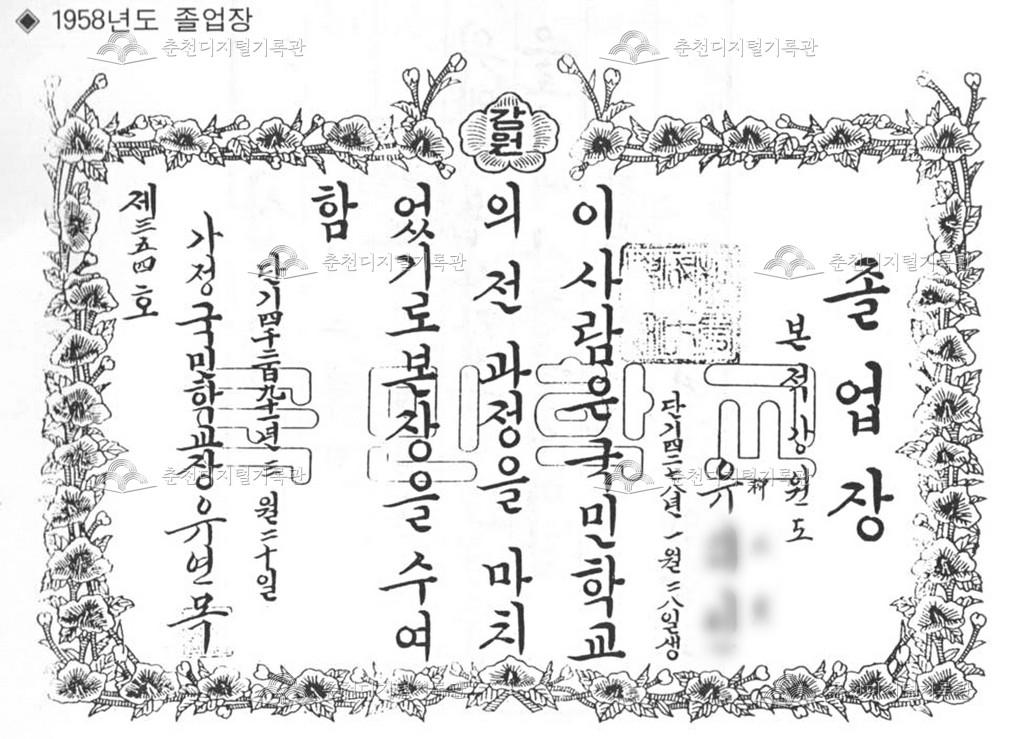 가정초등학교 졸업장 등록번호 00004956 생산일자 1958.03.20 생산지역 춘천 남면 가정리 생산자 미상 수집처 의암류인석기념관 소장자 의암류인석기념관 내용 남면 가정리 가정국민학교 1958년 졸업장이다. 가정국민학교는 2009년 남산초등학교로 통합되면서 폐교되었다. 사용안내 비상업적 이용만 가능|©춘천디지털기록관 상업적 사용·수정·재배포는 저작권자 동의 필요 다운로드 목록보기