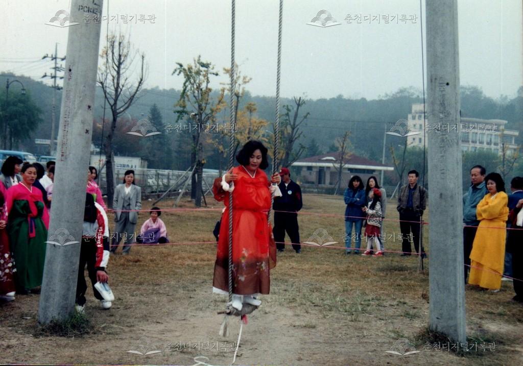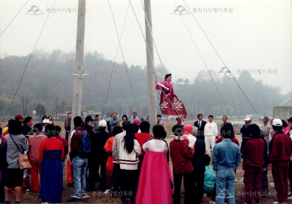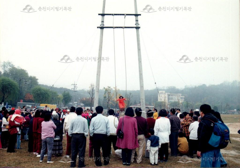 제18회 소양제 민속놀이 사진 등록번호 00002823 생산일자 1995.10 생산지역 춘천시 삼천동 생산자 춘천문화원 수집처 춘천문화원 소장자 춘천학연구소 내용 1995년 제18회 소양제(현재 소양강문화제)의 민속놀이 사진이다. 공지천 시민공원(현재 의암공원)에서 그네뛰기를 하는 모습이다. 뒤로 삼천리호텔이 보인다. 자세히 보기 닫기 사용안내 비상업적 이용만 가능|©춘천디지털기록관 상업적 사용·수정·재배포는 저작권자 동의 필요 다운로드 목록보기
