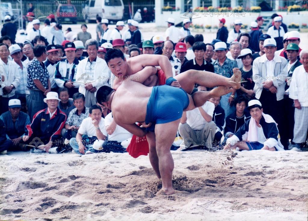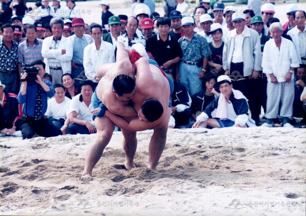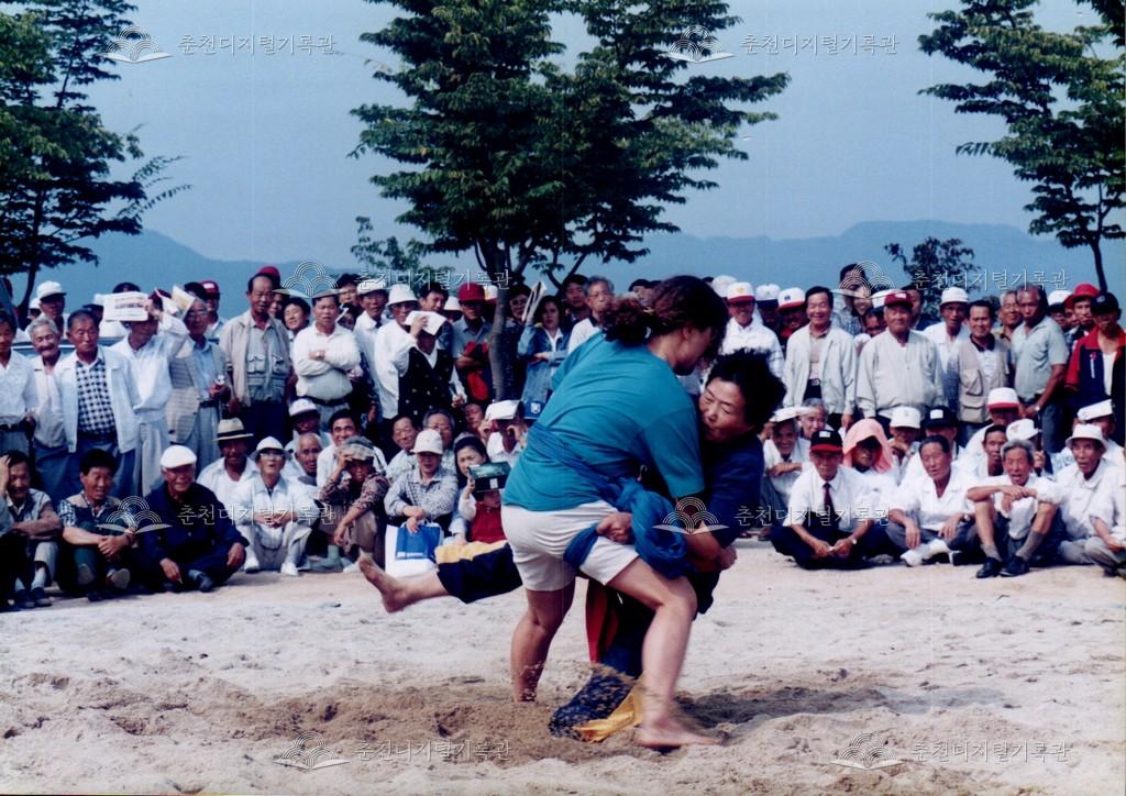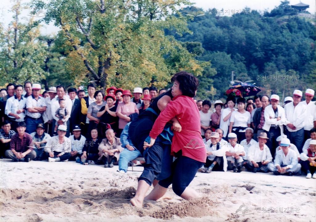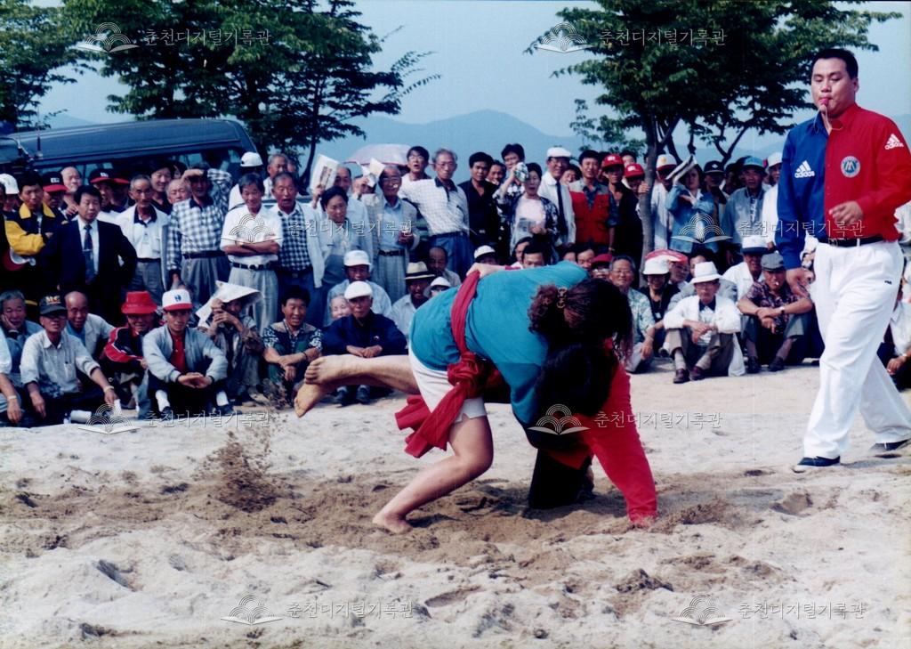 1998년 제21회 소양제(현재 소양강문화제)의 민속놀이 사진이다. 씨름 대회가 진행되고 있다.