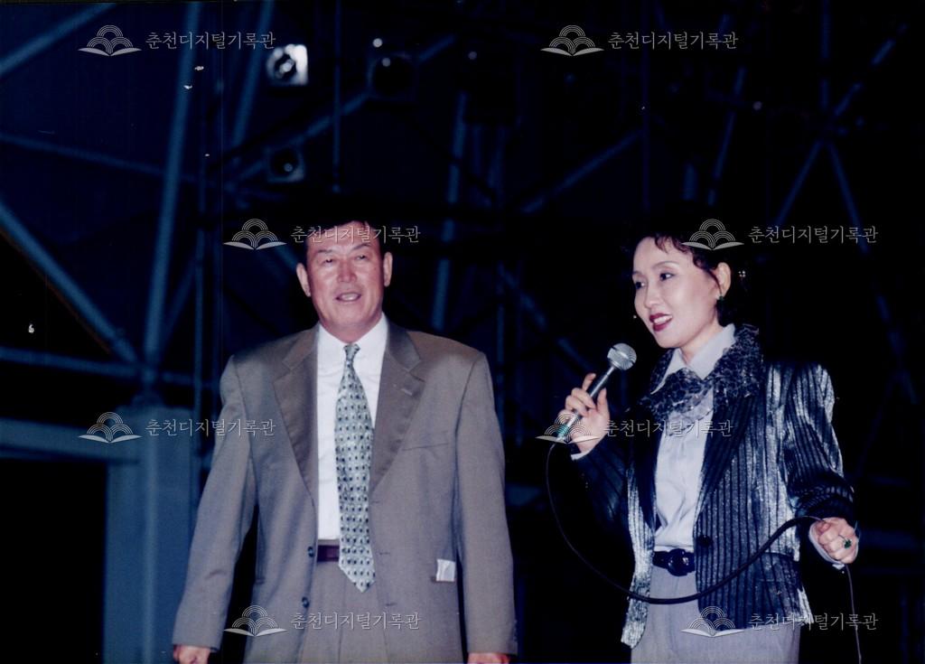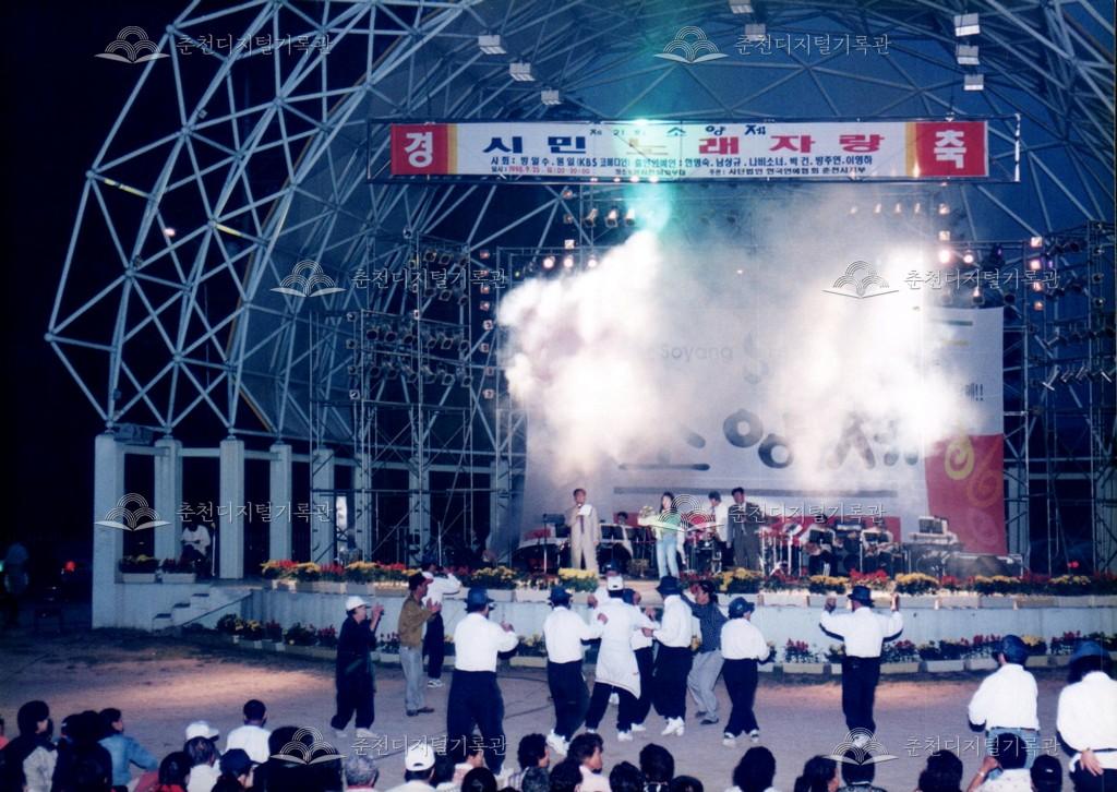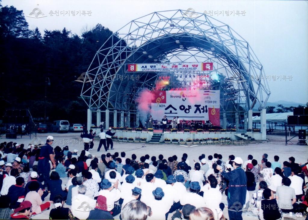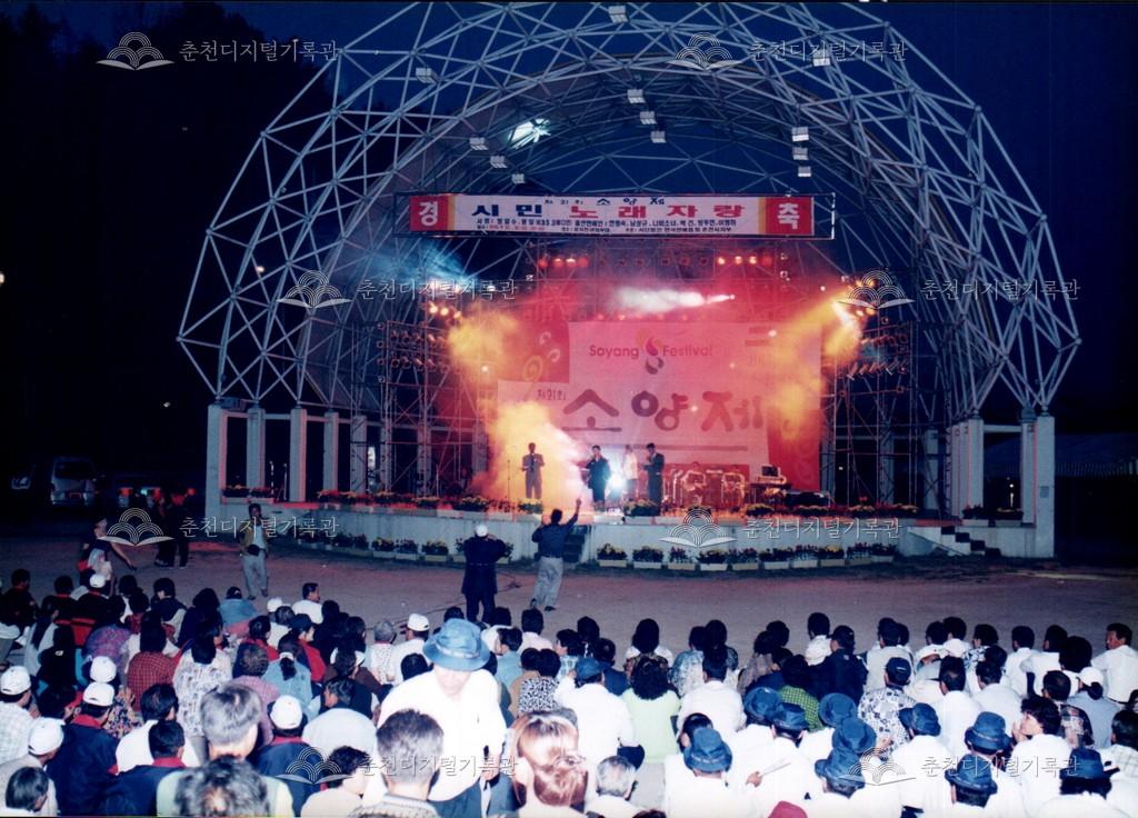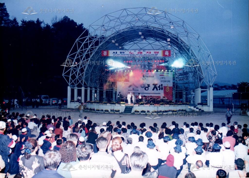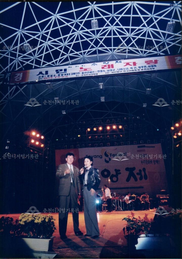 제21회 소양제 공연 사진 등록번호 00002902 생산일자 1998.09.25 생산지역 춘천시 삼천동 생산자 춘천문화원 수집처 춘천문화원 소장자 춘천학연구소 내용 1998년 제21회 소양제(현재 소양강문화제)의 시민노래자랑 사진이다. KBS 코미디언 방일수, 원일이 진행을 맡고 한명숙, 남상규, 나비소녀, 박건, 방주연, 이영하 등 연예인들이 특별출연했다. 자세히 보기 닫기 사용안내 비상업적 이용만 가능|©춘천디지털기록관 상업적 사용·수정·재배포는 저작권자 동의 필요 다운로드 목록보기