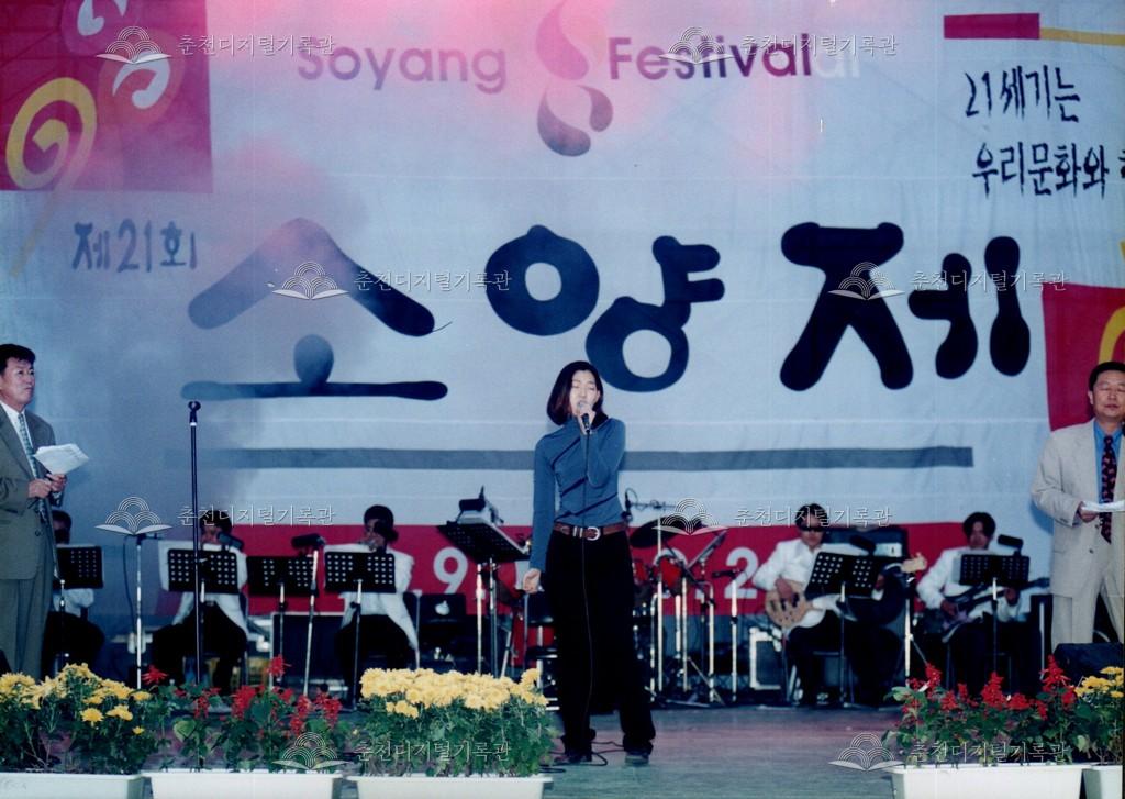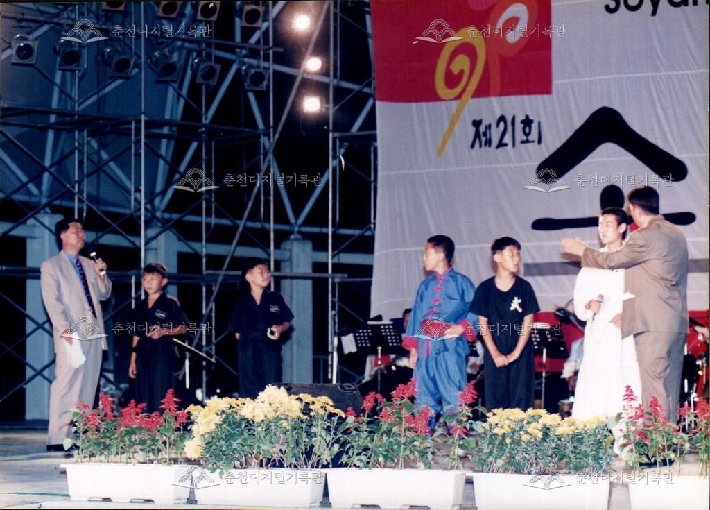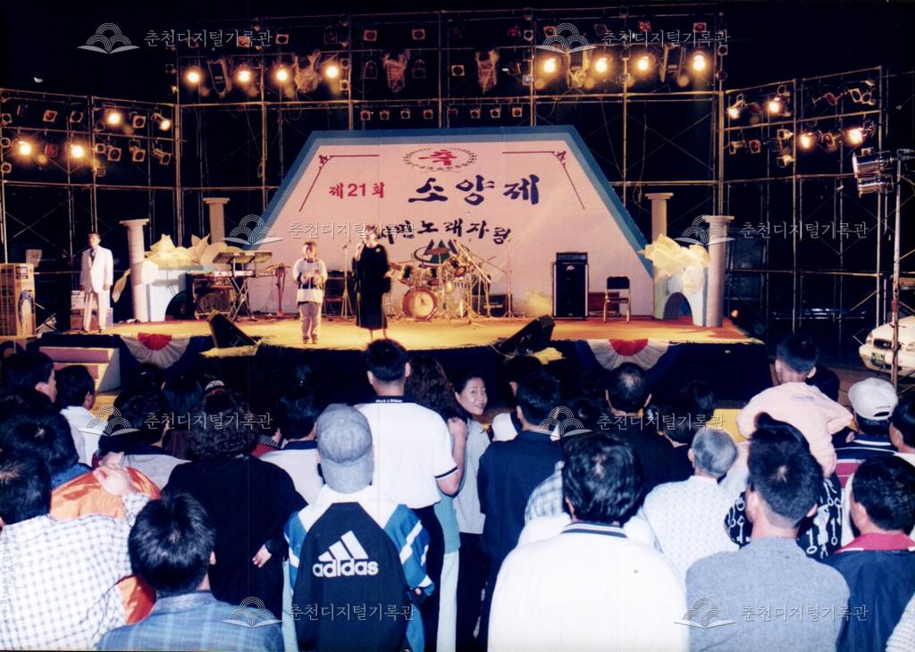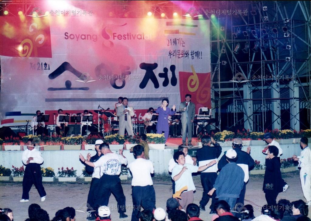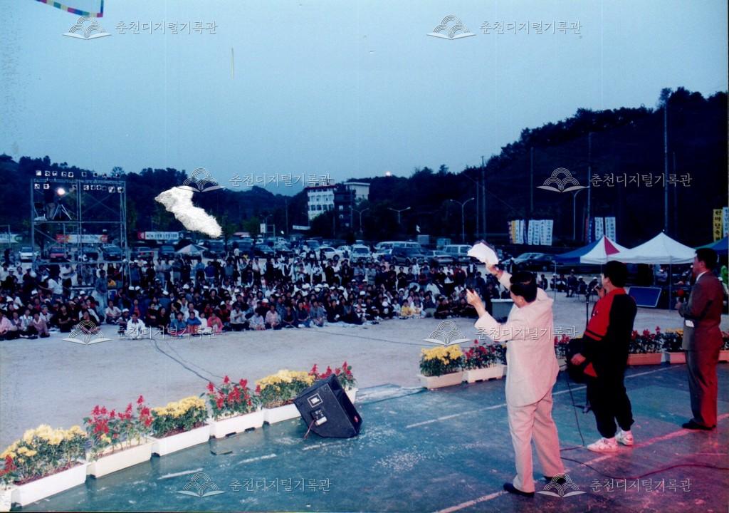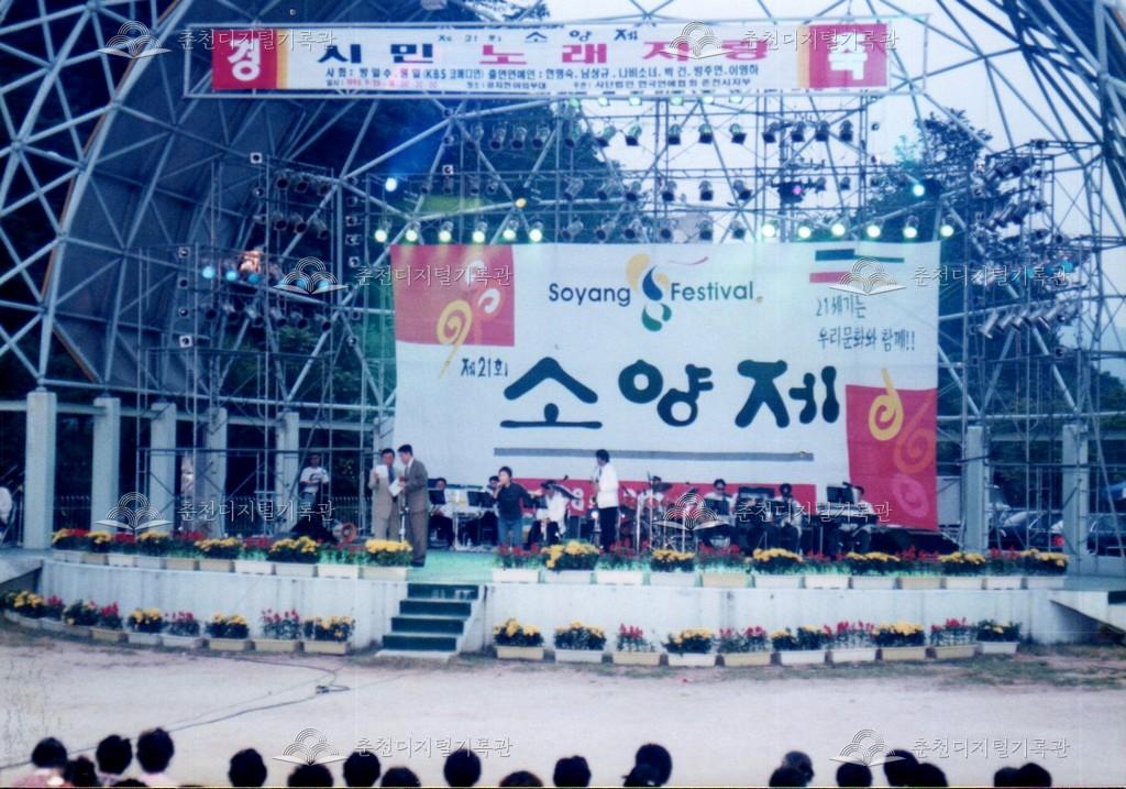 제21회 소양제 공연 사진 등록번호 00002902 생산일자 1998.09.25 생산지역 춘천시 삼천동 생산자 춘천문화원 수집처 춘천문화원 소장자 춘천학연구소 내용 1998년 제21회 소양제(현재 소양강문화제)의 시민노래자랑 사진이다. KBS 코미디언 방일수, 원일이 진행을 맡고 한명숙, 남상규, 나비소녀, 박건, 방주연, 이영하 등 연예인들이 특별출연했다. 자세히 보기 닫기 사용안내 비상업적 이용만 가능|©춘천디지털기록관 상업적 사용·수정·재배포는 저작권자 동의 필요 다운로드 목록보기