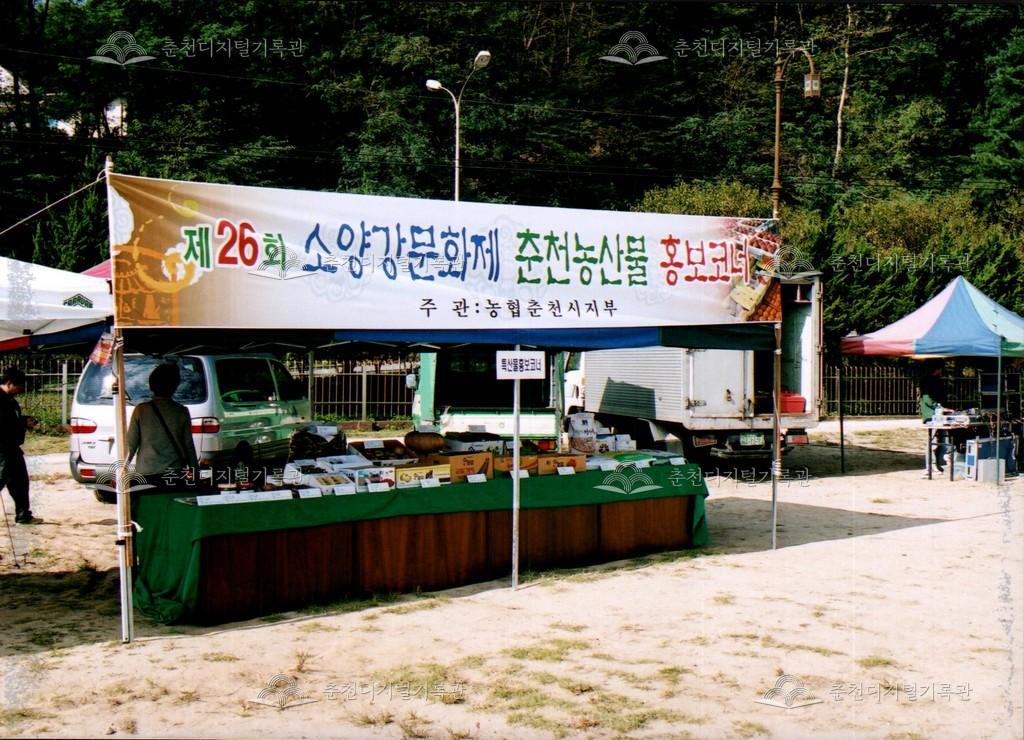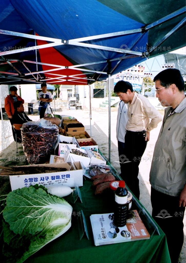 제26회 소양강문화제 행사 사진 등록번호 00003027 생산일자 2004.10.09 생산지역 춘천시 삼천동 생산자 춘천문화원 수집처 춘천문화원 소장자 춘천학연구소 내용 2004년 제26회 소양강문화제 행사 사진이다. 춘천농산물 홍보코너를 설치하여 홍보 및 판매를 하는 모습이다. 사용안내 비상업적 이용만 가능|©춘천디지털기록관 상업적 사용·수정·재배포는 저작권자 동의 필요 다운로드 목록보기