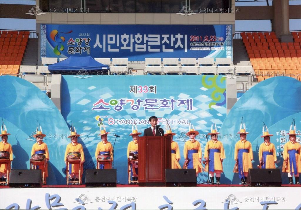 제33회 소양강문화제 개회식 사진 등록번호 00003293 생산일자 2011.09.23 생산지역 춘천시 송암동 생산자 춘천문화원 수집처 춘천문화원 소장자 춘천학연구소 내용 2011년 제33회 소양강문화제의 개회식 사진이다. 축사를 하는 이광준 34대 춘천시장의 모습이다, 사용안내 비상업적 이용만 가능|©춘천디지털기록관 상업적 사용·수정·재배포는 저작권자 동의 필요 다운로드 목록보기