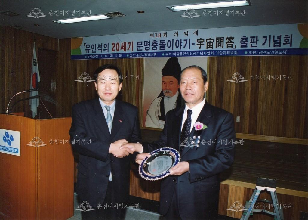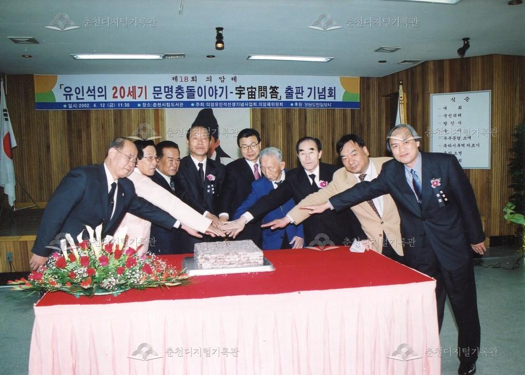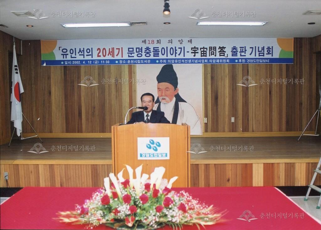2002년 제18회 의암제 중 출판기념회 사진이다. 『류인석의 20세기 문명 충돌 이야기 - 우주문답』 출판기념회가 4월 12일 춘천시립도서관(현재 춘천시립청소년도서관)에서 진행되었다.