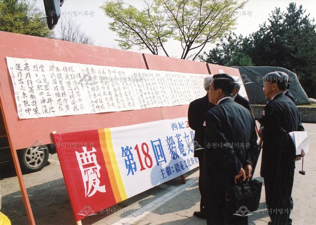 제18회 의암제 한시백일장 사진 등록번호 00003390 생산일자 2002.04.12 생산지역 춘천시 삼천동 생산자 춘천문화원 수집처 춘천문화원 소장자 춘천학연구소 내용 2002년 제18회 의암제 중 의암문화제 전국 지상 한시 백일장의 사진이다. 한시 작품이 춘천시립도서관(현재 춘천시립청소년도서관) 야외에 전시되었다. 자세히 보기 닫기 사용안내 비상업적 이용만 가능|©춘천디지털기록관 상업적 사용·수정·재배포는 저작권자 동의 필요 다운로드 목록보기