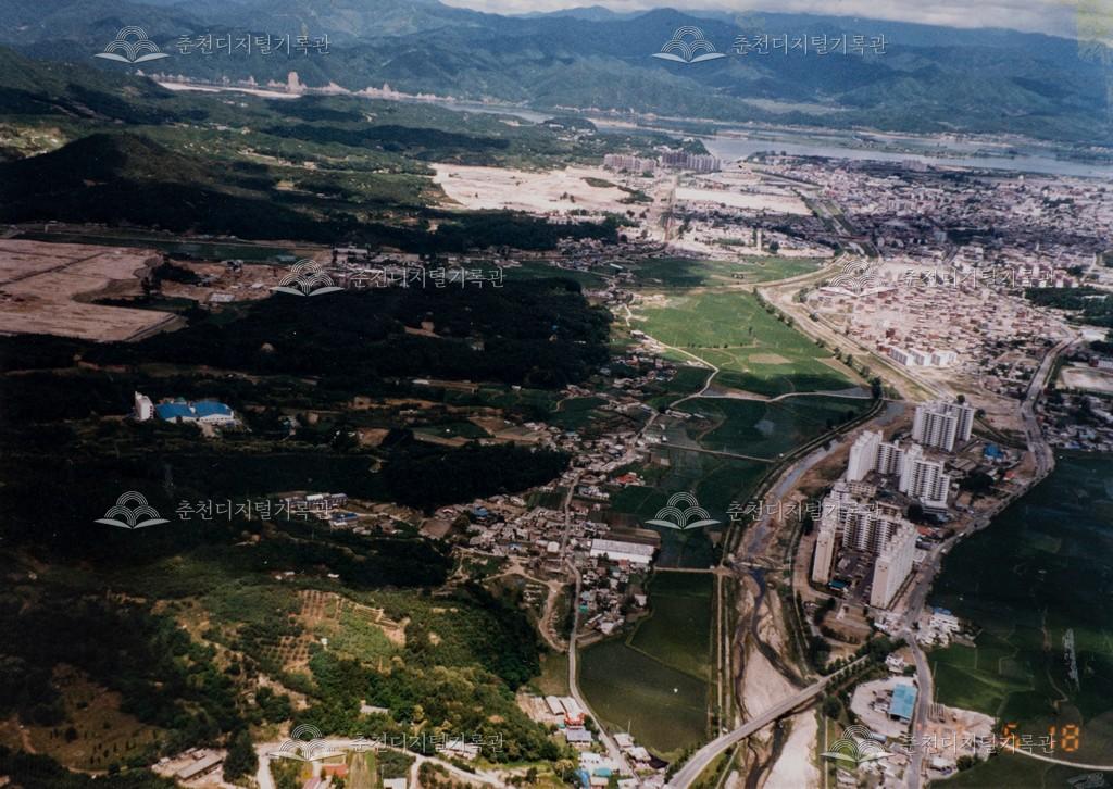 석사동 일대 개발이 진행되는 시기이다. 사진 우측 아래에 극동아파트, 삼익아파트, 봄내아파트가 건설되어 있고 석사동 주택단지가 들어서고 있다. 좌측 안마산 아래 스무숲과 퇴계동 일대는 개발 전이다.