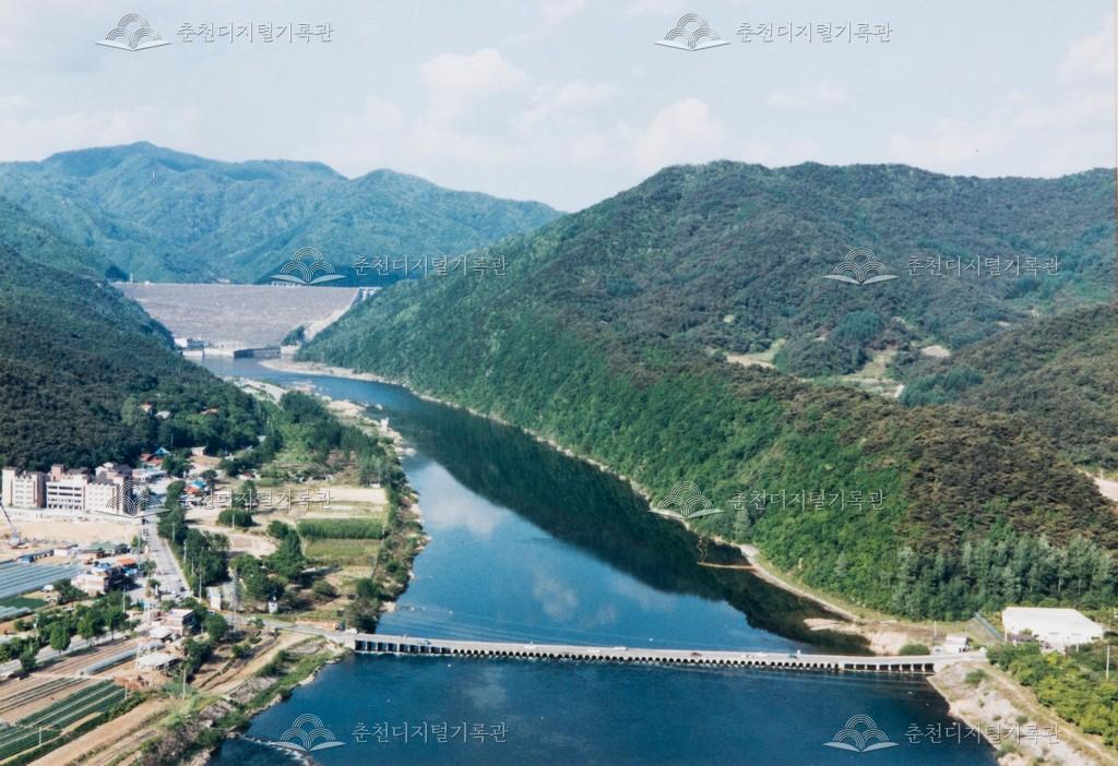 신북읍 천전리 일대 사진이다. 동면 월곡리와 천전리을 연결하는 세월교(코구멍 다리), 멀리 소양강댐이 보인다. 세월교는 1967년지내리 솔밭 인근에서 흙을 가져다가 소양강댐 공사용으로 사용하기 위해 건설한 다리이다. 소양강댐 방류시 물이 다리를 넘는다는 뜻으로 세월교(洗越橋)라는 이름이 붙었다.