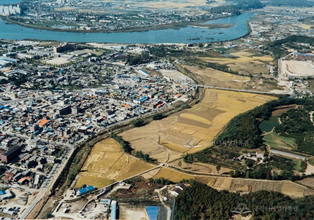 후평동 일대와 동면 장학리 농경지 전경이다. 장학리 농경지는 택지 개발로 공동주택단지(장학아이파크, 두산위브아파트)가 들어섰다.