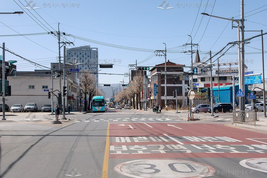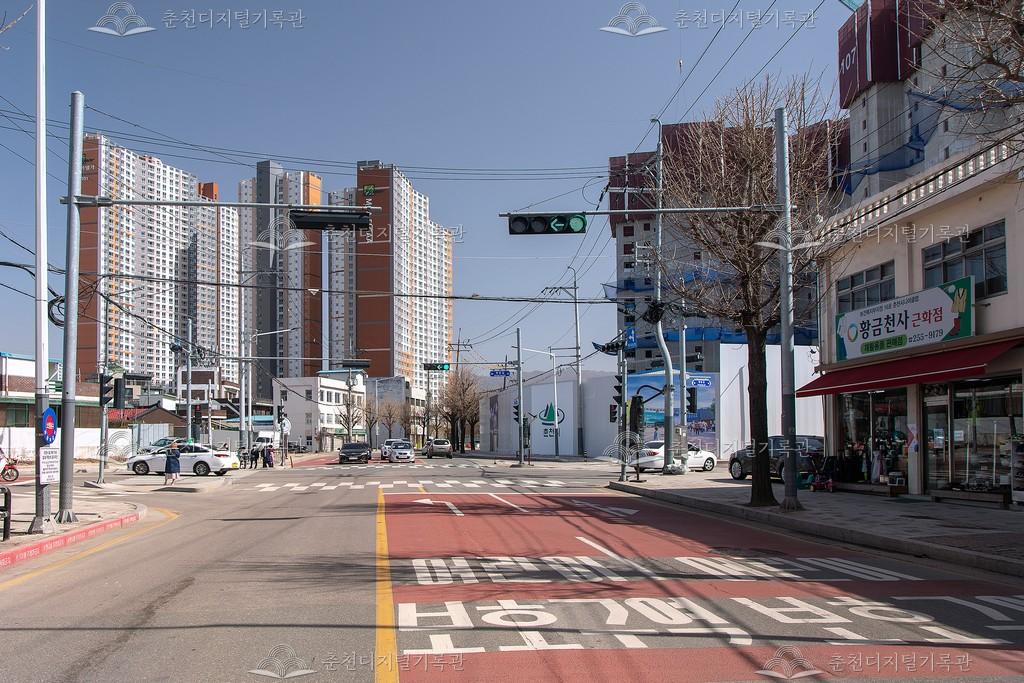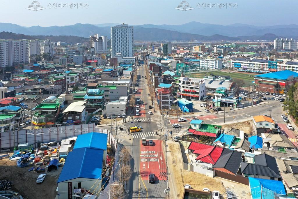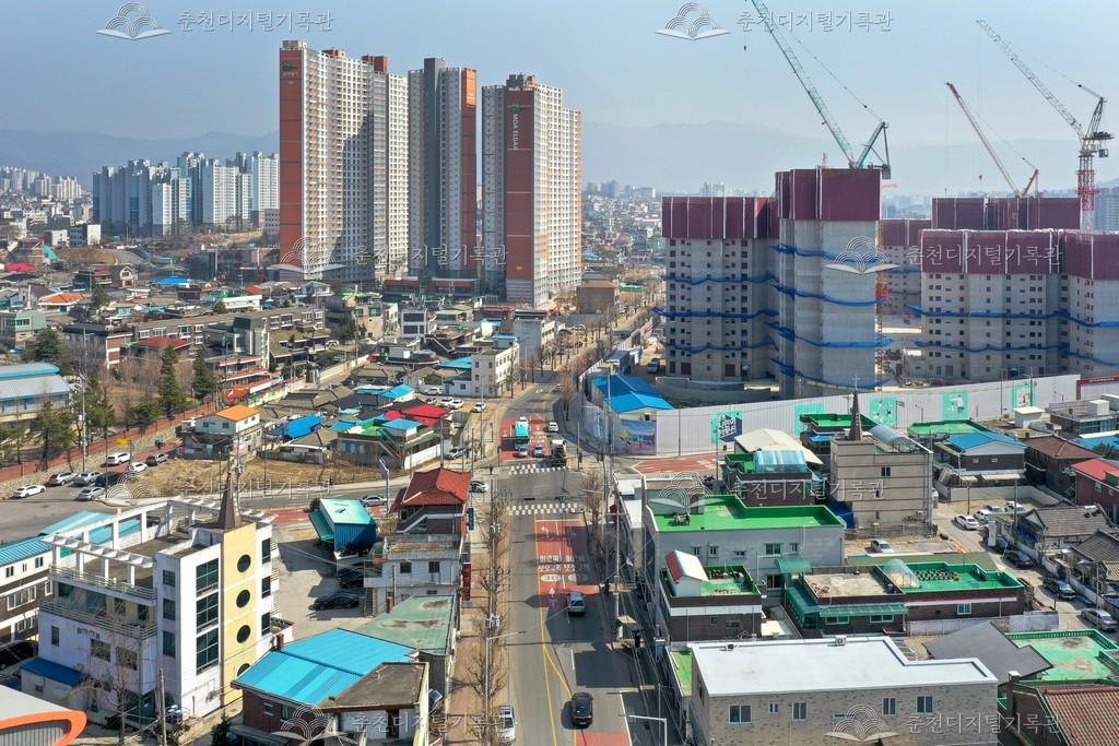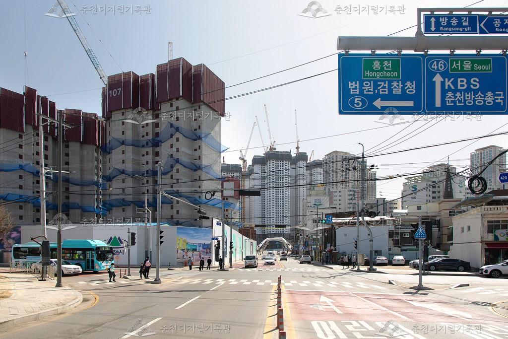 근화동 꽃돼지분식 앞 사거리 사진이다. 공사 중인 롯데캐슬위너클래스, 약사지구 모아엘가센텀뷰, 춘천초등학교, 춘천중학교, 온의교가 보인다.