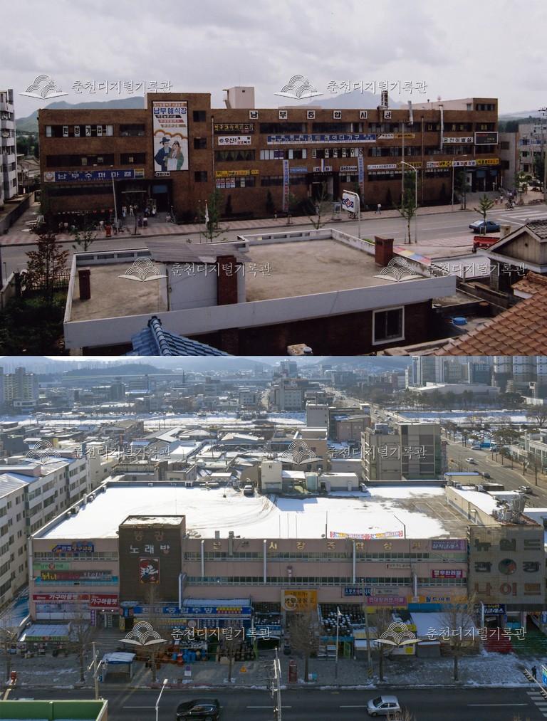 효자1동 비교 사진 등록번호 00001075 생산일자 2020.12 생산지역 춘천시 효자동 효자1동 생산자 춘천학연구소 수집처 미상 소장자 춘천학연구소 내용 효자1동 비교 사진. 위 사진: 남부시장, 춘천공무원아파트 아래 사진: 남부시장 상가, 춘천공무원아파트 사용안내 비상업적 이용만 가능|©춘천디지털기록관 상업적 사용·수정·재배포는 저작권자 동의 필요 다운로드 목록보기