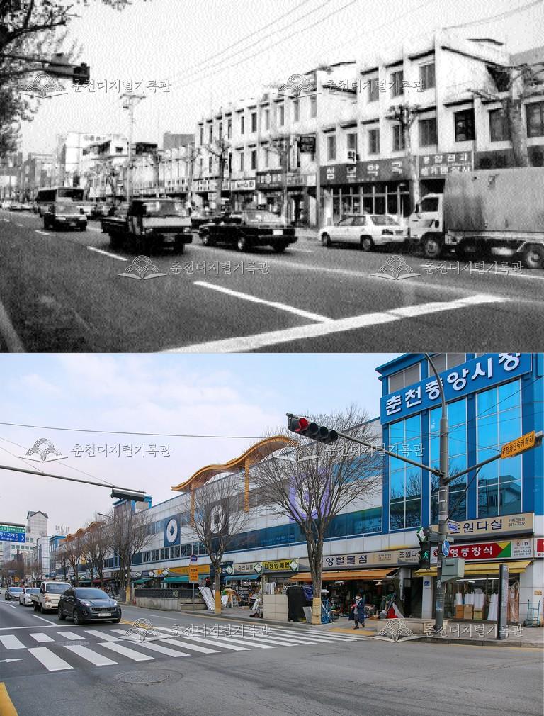 춘천의 어제와 오늘-춘천시 전경 비교 사진 등록번호 00001116 생산일자 2021.03 생산지역 춘천시 생산자 춘천학연구소 수집처 미상 소장자 춘천학연구소 내용 위 사진: 리모델링 이전 춘천중앙시장. 아래 사진: 2020년 춘천중앙시장 사용안내 비상업적 이용만 가능|©춘천디지털기록관 상업적 사용·수정·재배포는 저작권자 동의 필요 다운로드 목록보기