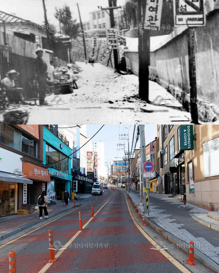 위 사진: 1960년대 춘성군청 옆 골목. 사진상단 가운데 보이는 건물이 당시 법원, 검찰청 건물.