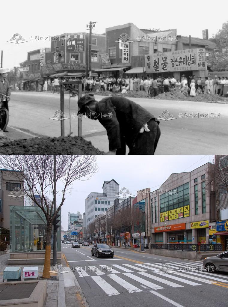 춘천의 어제와 오늘-춘천시 전경 비교 사진 등록번호 00001139 생산일자 2021.03 생산지역 춘천시 생산자 춘천학연구소 수집처 미상 소장자 춘천학연구소 내용 위 사진: 1962년 중앙로 로터리 부근에 가로수를 심는 모습 아래 사진: 2020년. 중앙시장교차로에서 중앙로타리 방향. 중앙로2가. 자세히 보기 닫기 사용안내 비상업적 이용만 가능|©춘천디지털기록관 상업적 사용·수정·재배포는 저작권자 동의 필요 다운로드 목록보기