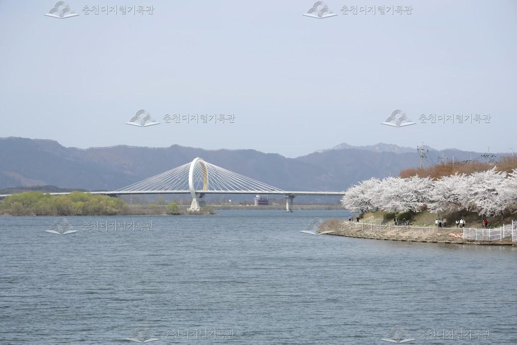 근화동 공지천에 만개한 벚꽃 사진이다. 중도로 갈 수 있는 춘천대교도 보인다.