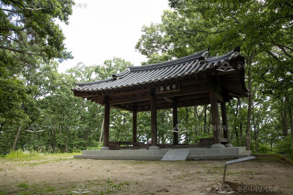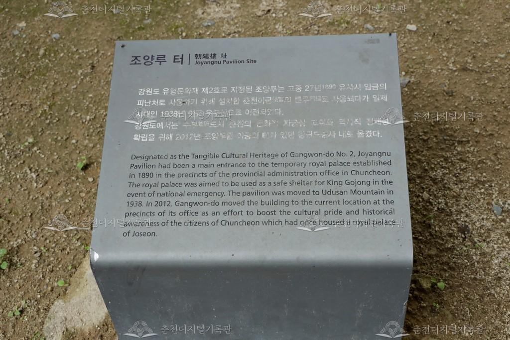 우두동 우두산에 위치한 우두정의 모습과 조양루 터에 대한 안내문이다. 이 자리는 강원도 유형문화재 제2호로 지정된 조양루가 1938년 봉의동 춘천이궁 자리에서 우두산으로 옮겨와 있던 자리이다. 2012년 조양루는 본래의 자리로 복원되어 이전했다.