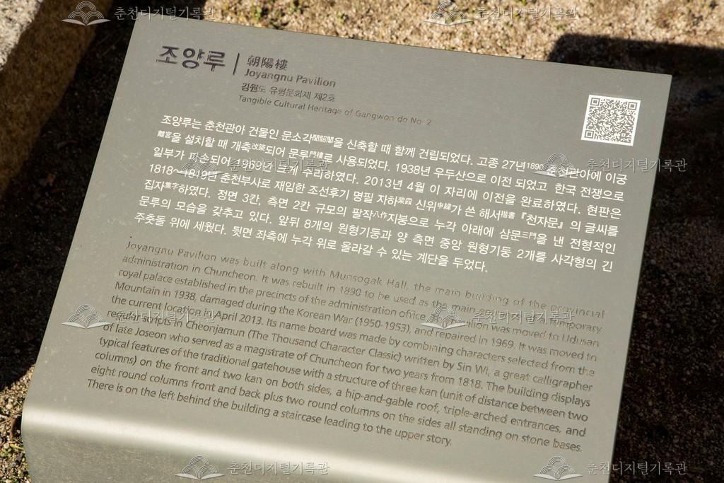 봉의동 강원특별자치도청 내 조양루의 사진이다. 조양루는 춘천관아 건물인 문소각(聞韶閣)을 신축할 때 함께 건립되었다. 고종 27년인 1890년 춘천관아에 이궁(離宮)을 설치할 때 개축(改築)되어 문루(門樓)로 사용되었다. 1938년 우두산으로 이전 되었고, 한국전쟁으로 일부가 파손되어 1969년 크게 수리하였다. 2013년 4월 현재 위치로 이전을 완료하였다. 현판은 1818~1819년 춘천부사로 재임한 조선후기 명필 자하(紫霞) 신위(申緯)가 쓴 해서천자문의 글씨를 집자(集字)하여 복각하였다. 정면 3칸, 측면 2칸 규모의 팔작지붕으로 누각 아래에 삼문을 낸 전형적인 문루의 모습을 갖추고 있다. 앞뒤 8개의 원형기둥과 양 측면 중앙 원형기둥 2개를 사각형의 긴 주춧돌 위에 세웠다. 뒷면 좌측에 누각 위로 올라갈 수 있는 계단을 두었다.