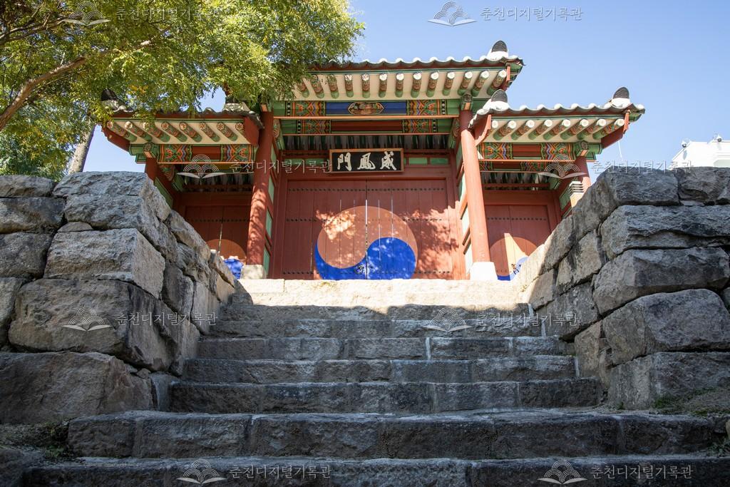 봉의동 강원특별자치도청 내 위봉문의 사진이다. 위봉문은 춘천관아 건물인 문소각(聞韶閣)을 신축할 때 내삼문(內三門)으로 함께 건립되었다. 고종 27년인 1890년 춘천관아에 이궁(離宮)이 설치되면서 위봉문은 이궁의 내삼문으로 사용되었다. 한국전쟁으로 인한 문소각 소실과 강원도청사 건립으로 몇 차례 이전되어 있던 것을 2013년 4월 이 자리에 이전을 완료하였다. 현판글씨는 조선후기 명필이었던 송하옹(松下翁) 조윤형(曺允亨)이 쓴 것이다. 정면 3칸, 측면 2칸 규모의 맞배지붕으로 내삼문의 전형인 솟을대문 양식을 온전히 갖추고 있다. 한 단의 장대석(長臺石) 기단을 놓고 앞뒤 8개의 원형기둥을 사각형의 주춧돌 위에 세웠다.