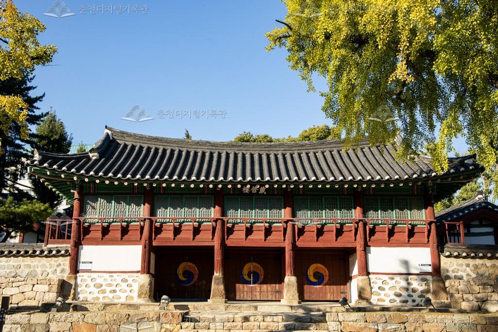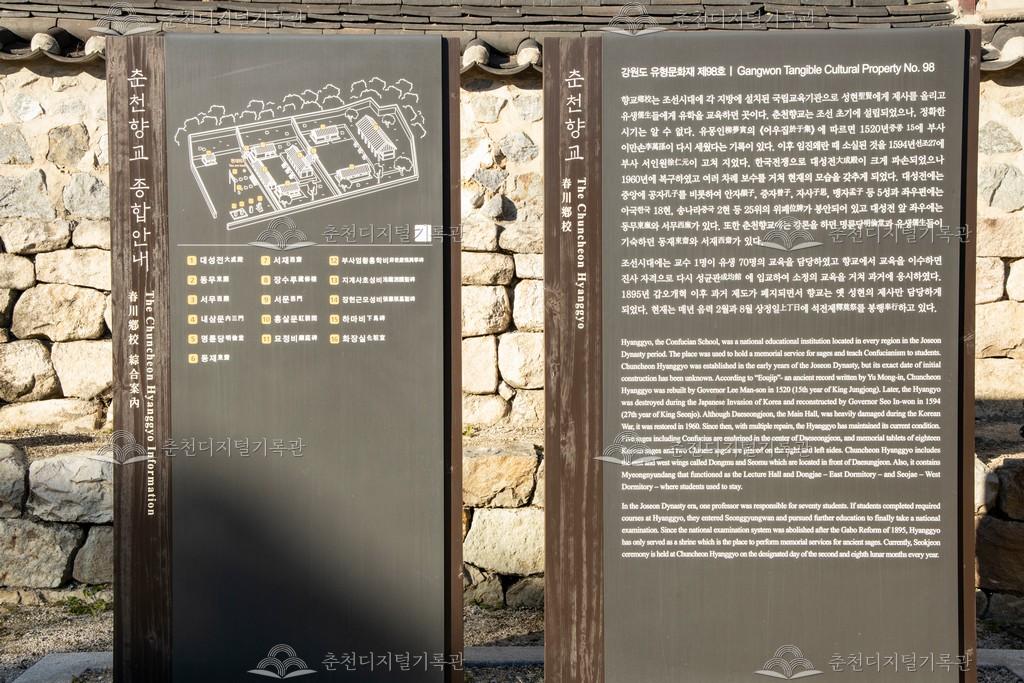 교동에 위치한 춘천향교의 모습이다. 향교는 훌륭한 유학자를 제사하고 지방민의 유학교육과 교화를 위하여 나라에서 지은 교육기관이다. 처음 지은 연대는 전하지 않고 임진왜란 때 불탄 것을 선조 27년(1594)에 다시 지었다. 그 후 여러 차례의 수리가 있었으며, 한국전쟁으로 불탄 것을 1960년에 복원하였다. 지금 남아있는 건물은 대성전과 명륜당·장수루·동재·서재·동무·서무·내삼문 등이다. 대성전은 사당으로 공자를 비롯하여 중국과 우리나라 유학자의 위패를 모시고 있다. 명륜당은 학생들이 모여서 공부하는 강당으로 교화의 원천이 되기도 하였다. 조선시대에는 나라로부터 토지와 책·노비 등을 지급 받아 운영하였다. 갑오개혁(1894) 이후 교육적 기능은 없어지고 지금은 제사의 기능만 남아있다.『수춘향약』·『향중좌목』·『향안』 등 이 지방 향토사연구에 귀중한 책들을 소장하고 있다.