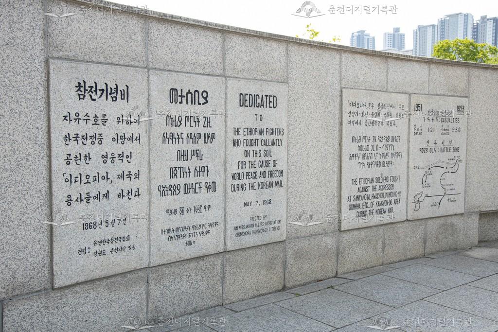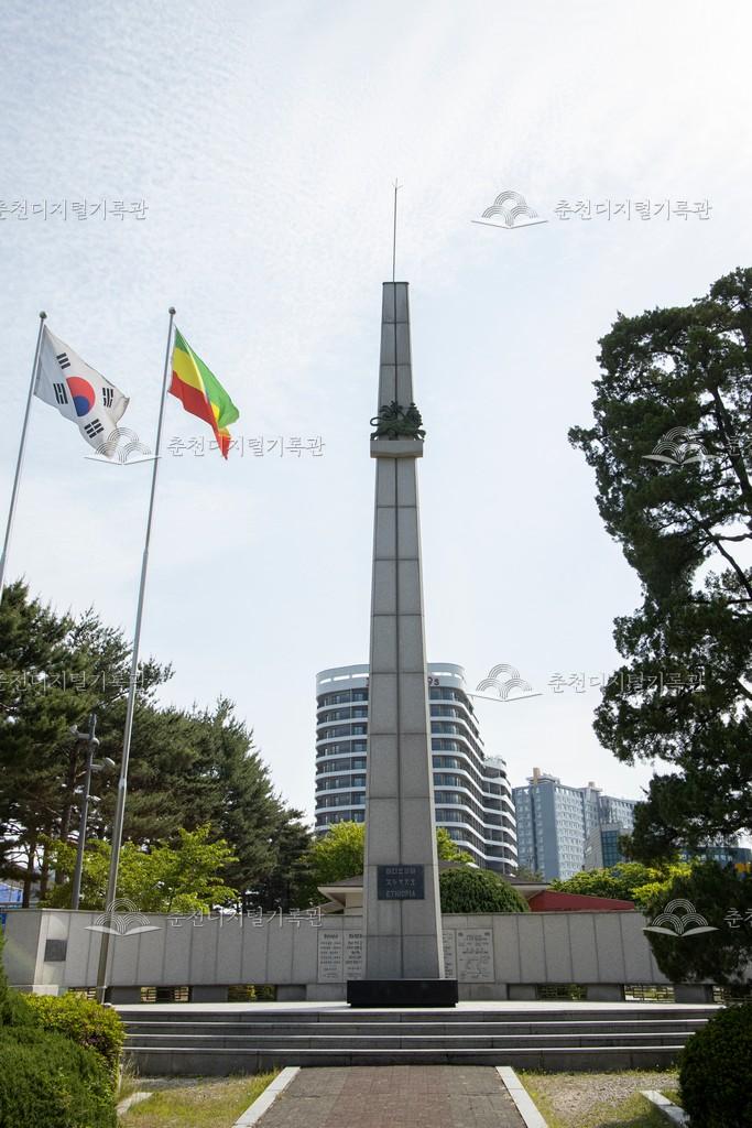 근화동 공지천조각공원에 서 있는 기념비이다. 에티오피아군은 1951년 5월 1일 한국에 도착하여 1955년 3월 1일 철수할 때까지 3개 대대 6, 037명을 파병하였고, 253회 전투를 치렀다. 에티오피아 각뉴 부대(Kagnew Battalion)는 253회의 전투에서 전부 승리하여 단 한 명의 포로도 나오지 않았지만 참전용사 중 121명이 사망하고 536명이 부상당했다. 이러한 혁혁한 전공으로 인해 한국과 미국으로부터 여러 차례 부대 표창과 훈장을 받았다. 유엔한국참전국협회는 1968년 5월 7일 강원 춘천시 근화동 361-1(조각공원)에 세계평화와 민주주의 수호를 위해 헌신적으로 싸운 에티오피아 참전군의 공적을 기리기 위해 이 참전기념비를 건립하였다.