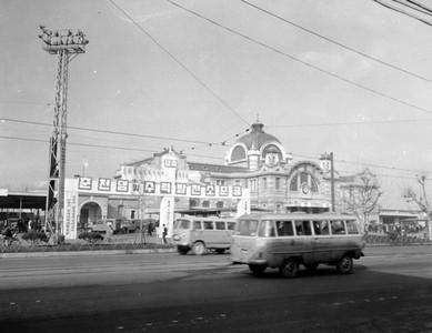 1965년에 촬영한 춘천댐과 수력발전소 준공 축하 홍보탑이다. 홍보탑이 설치 된 곳은 서울역 앞이다.