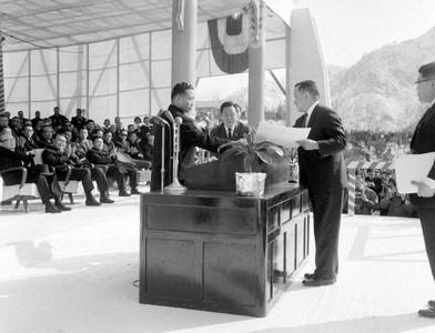춘천댐 준공식 사진 등록번호 00001577 생산일자 1965.02.10 생산지역 춘천시 신북읍 용산리 생산자 공보처 홍보국 사진담당관 수집처 국가기록원 소장자 국가기록원 내용 1965년에 촬영한 춘천댐 준공식 사진이다. 준공식에 참석한 박정희 전 대통령의 모습이 보인다. 사용안내 외부 제공 | 열람·다운로드는 원 기관 사이트 이용 ※ 저작권은 해당 기관에 있음 관련사이트 이동 목록보기