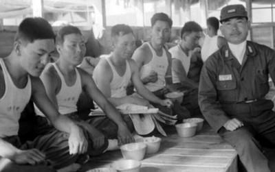 1962년에 촬영한 춘천 공사 현장 사진이다. 국도 건설에 투입된 국민합동국토건설사업단(국토건설단)의 식사 모습이다.