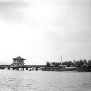 1975년에 촬영한 공지천 일대 사진이다. 사진 좌측부터 팔각정(호수의 집), 2차선 공지천교, 에티오피아참전기념탑이 보인다.