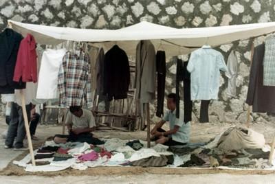 춘천 시내 풍경 사진이다. 옷을 파는 노점상이 보인다.