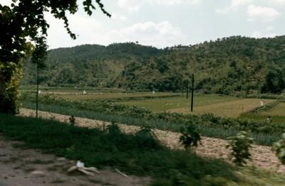 춘천 가는 차 안에서 촬영한 춘천 주변 풍경 사진이다. 산과 논이 보인다.