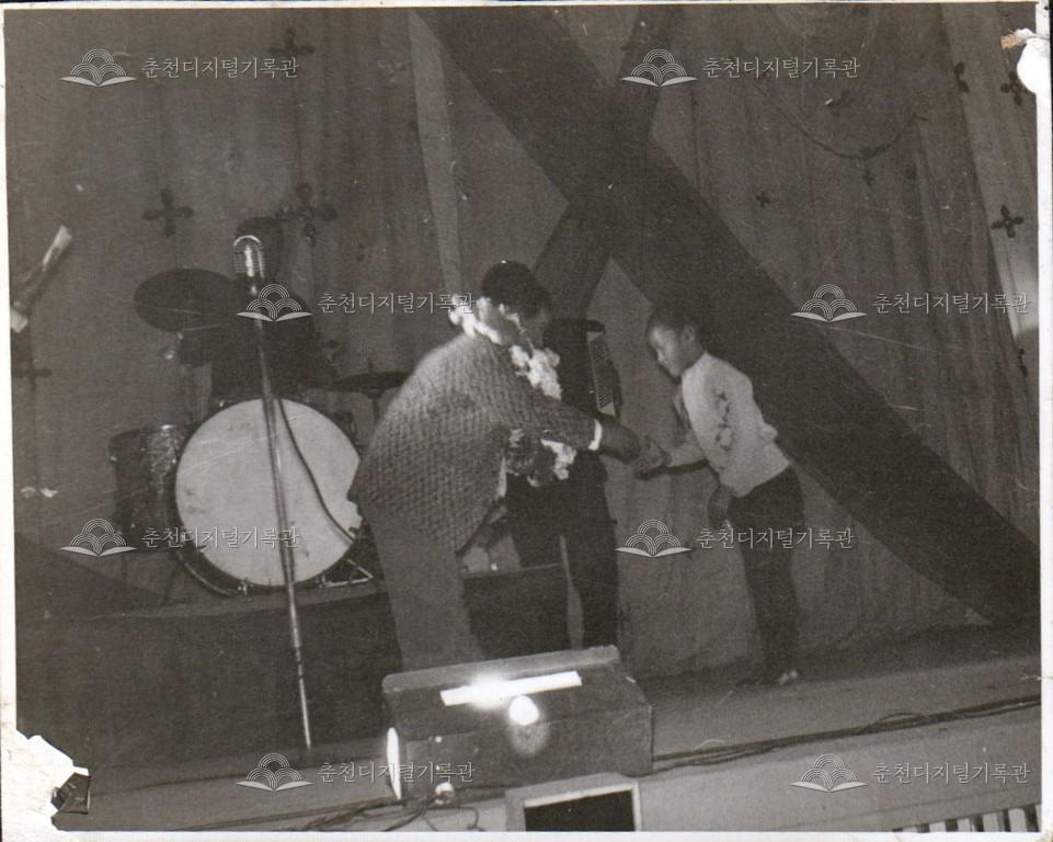 1960년대 만담가 장소팔이 춘천을 방문하여 공연한 당시 사진이다. 장소팔에게 꽃다발을 증정하는 모습이다.