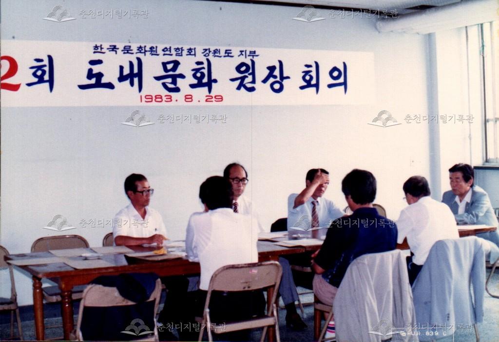 제2회 도내문화원장회의 사진 등록번호 00002267 생산일자 1983.08.29 생산지역 미상 생산자 춘천문화원 수집처 춘천문화원 소장자 춘천학연구소 내용 1983년에 촬영한 제2회 도내 문화원장 회의의 사진이다. 한국문화원연합회 강원도지부 소속 문화원장들이 보인다. 사용안내 비상업적 이용만 가능|©춘천디지털기록관 상업적 사용·수정·재배포는 저작권자 동의 필요 다운로드 목록보기