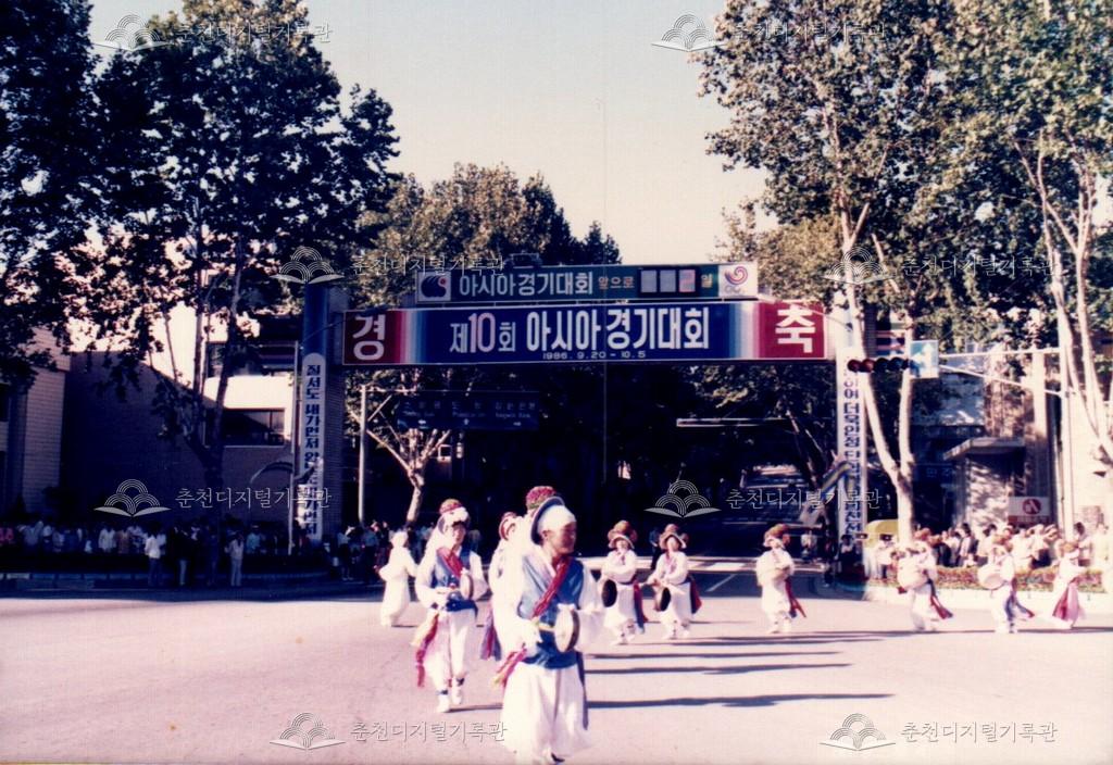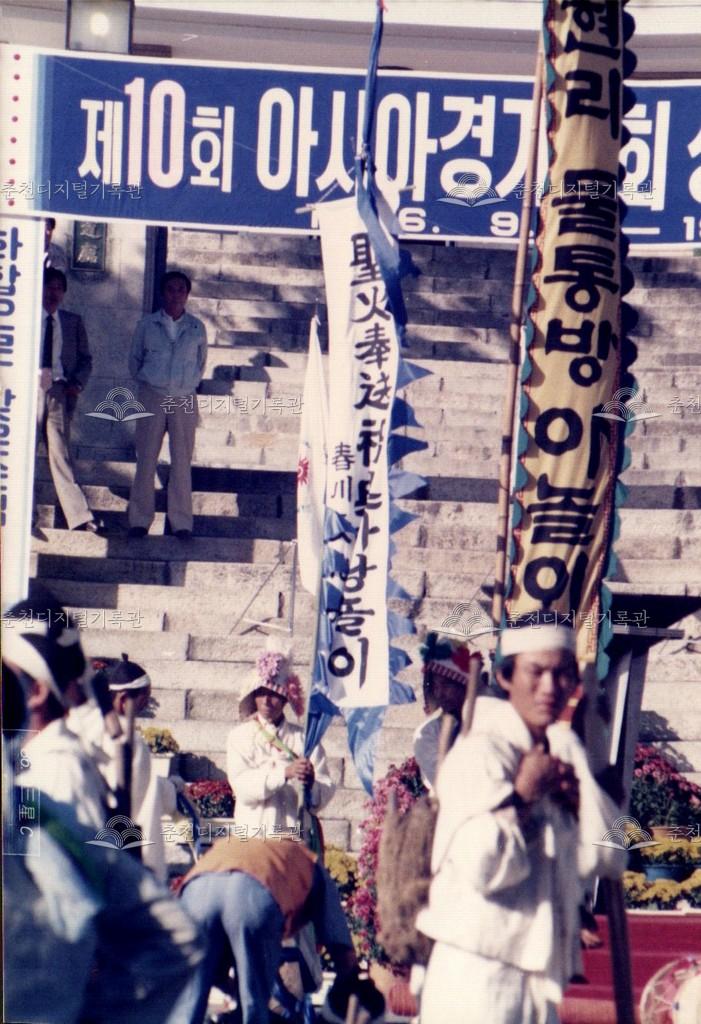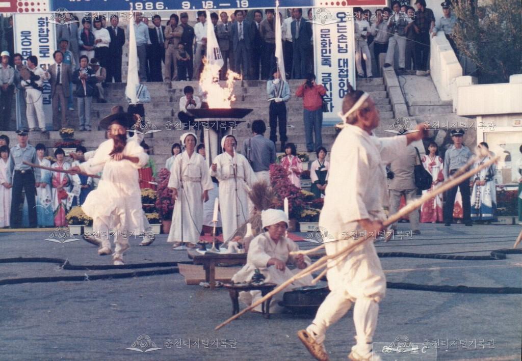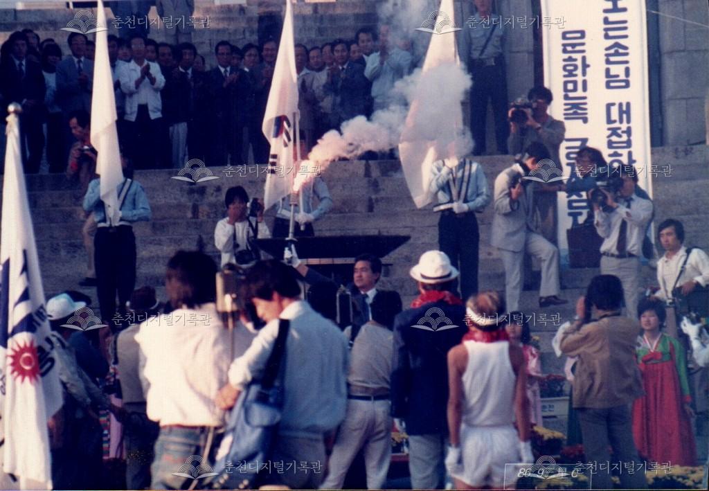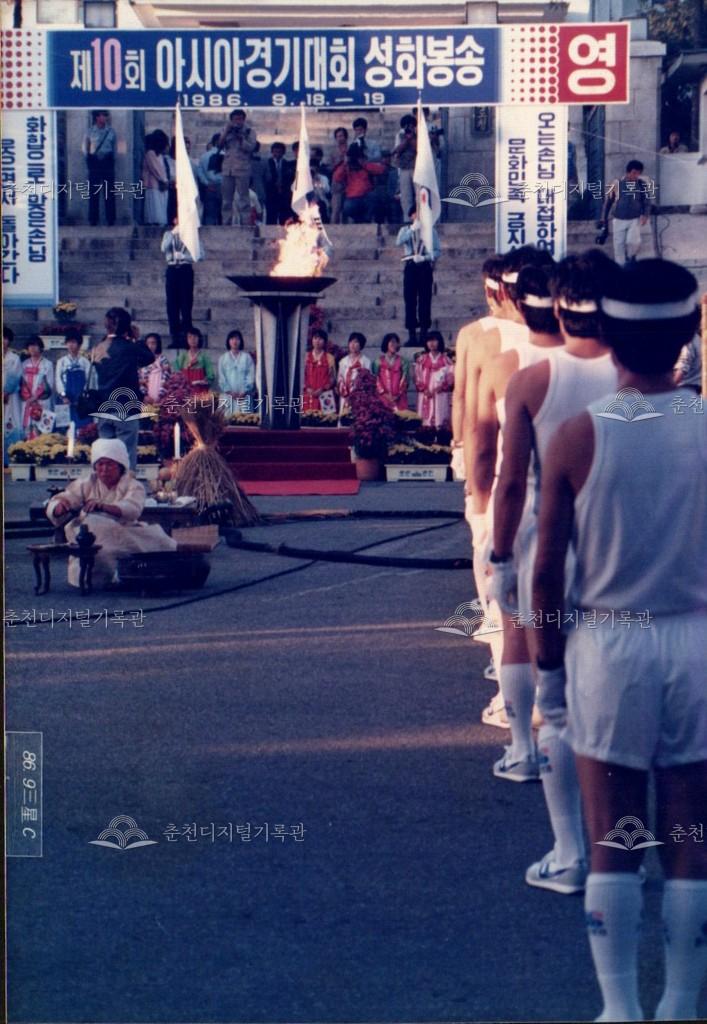 1986년 9월 18일, 19일간 진행된 제10회 아시아경기대회(서울아시안게임) 성화 봉송 관련 사진이다. 9월 20일부터 10월 5일까지 서울에서 개최되는 제10회 아시아경기대회의 성화 봉송이 중앙로터리, 도청앞광장 등 춘천 시내에서 진행되었다. 이와 관련하여 춘천시와 춘천문화원에서는 성화봉송맞이 민속축전을 진행하였으며 농악 길놀이, 마당놀이 등, 민속놀이를 선보였다.